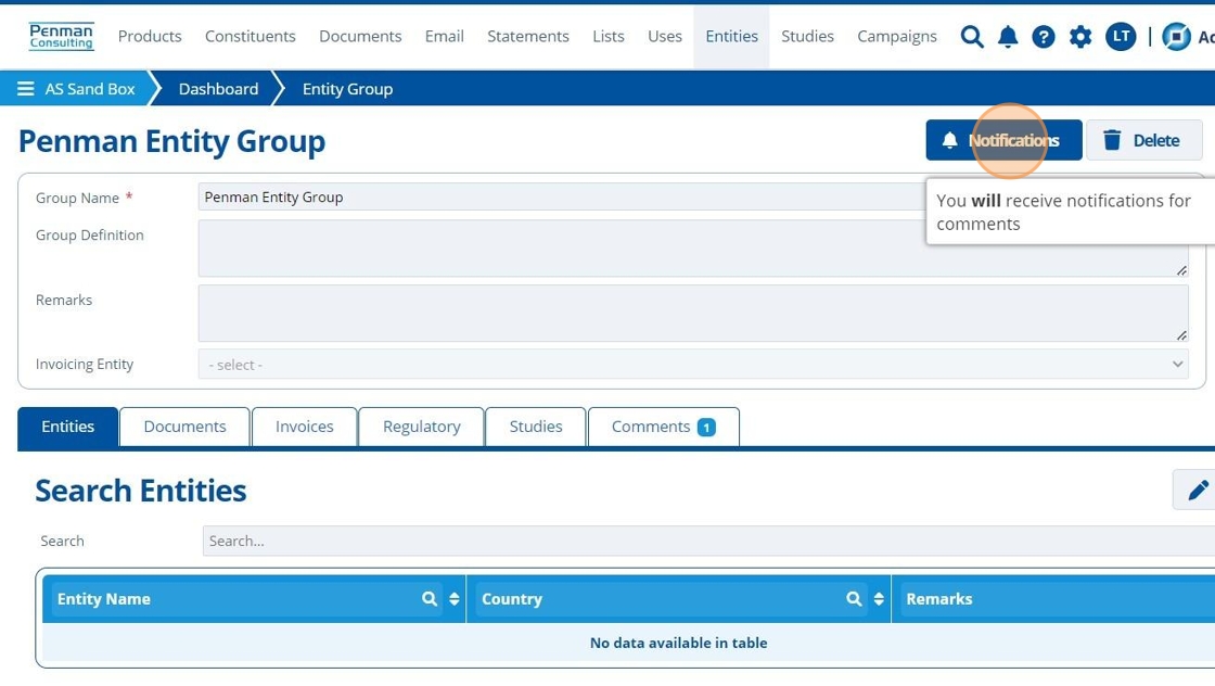 19. On an Entity Group, 👆 click the "Notifications" button to turn on notifications. Notifications will be sent for:¶
