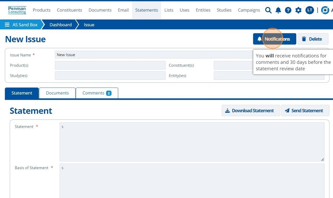 17. On an Issue & Statement, 👆 click the "Notifications" button to turn on notifications. Notifications will be sent for:¶