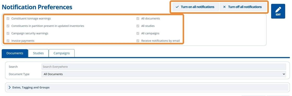 Document / Study / Campaign notification preferences can be edited in the "Notification Preferences" screen.