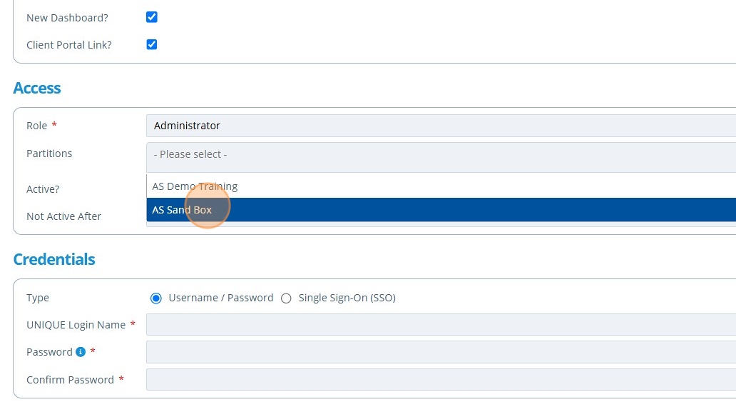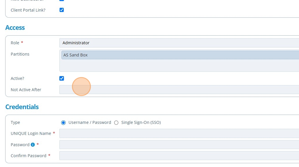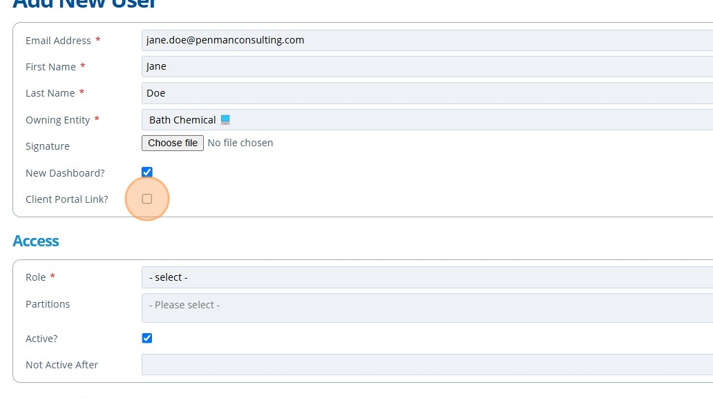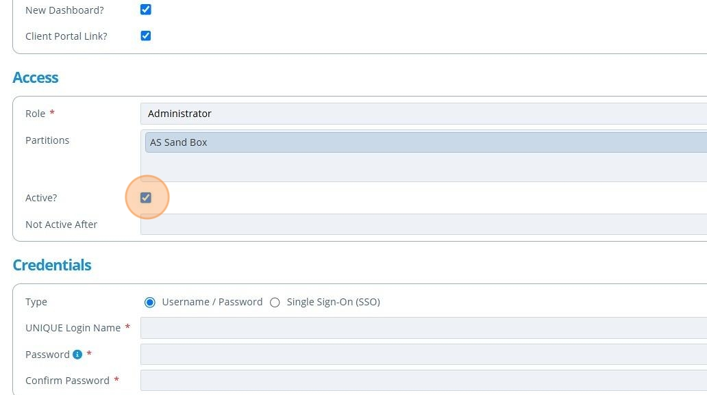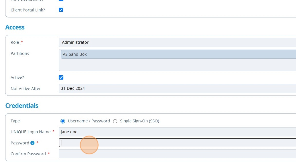 6. 👆 Tick the "Client Portal Link?" field if there is to be a campaign for this user to view in another instance of Active Steward.¶
