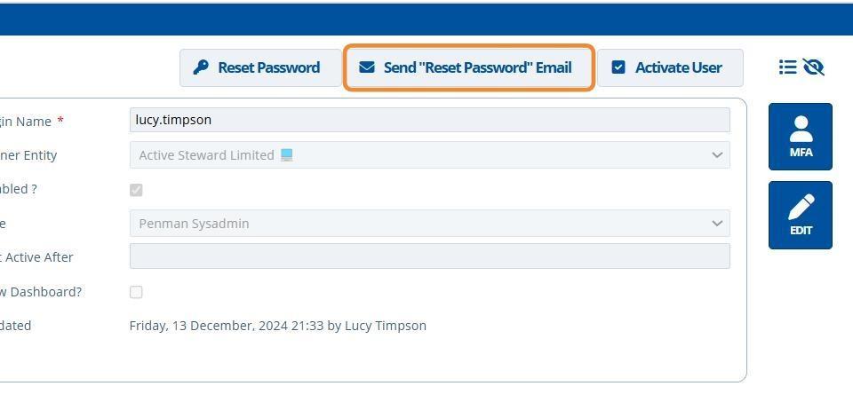 Sending a "Reset password" email creates a temporary password that will be sent to the users email address. If they are a new user, the email will be a "Welcome" email which contains their username, temporary password and a link to the Active Steward website.