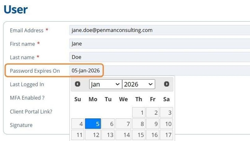 A specific password expiry date can also be given to individual (non SSO) user accounts by editing their account after creation.