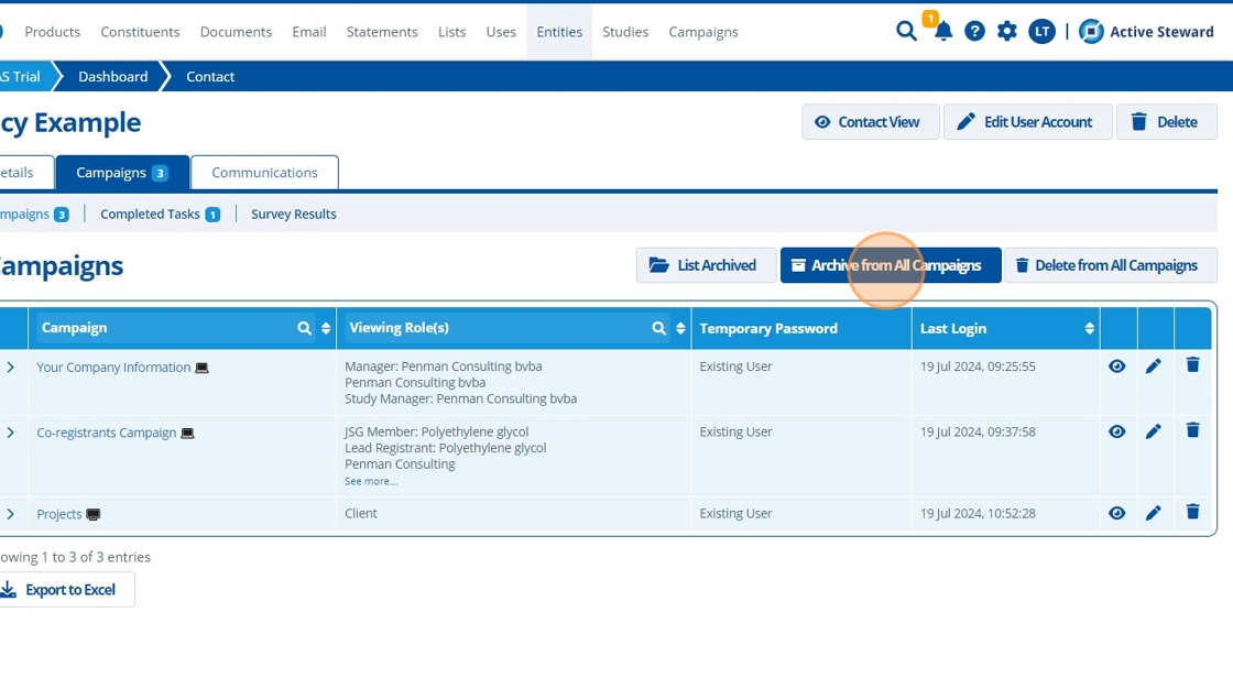 Archiving a contact from a campaign means that their access to that campaign will be removed. The contacts completed tasks and survey results from this campaign will remain.