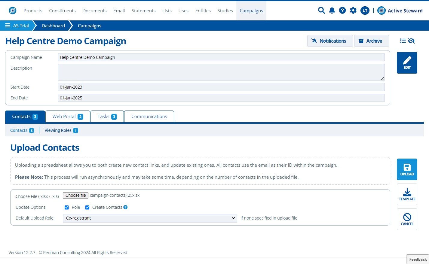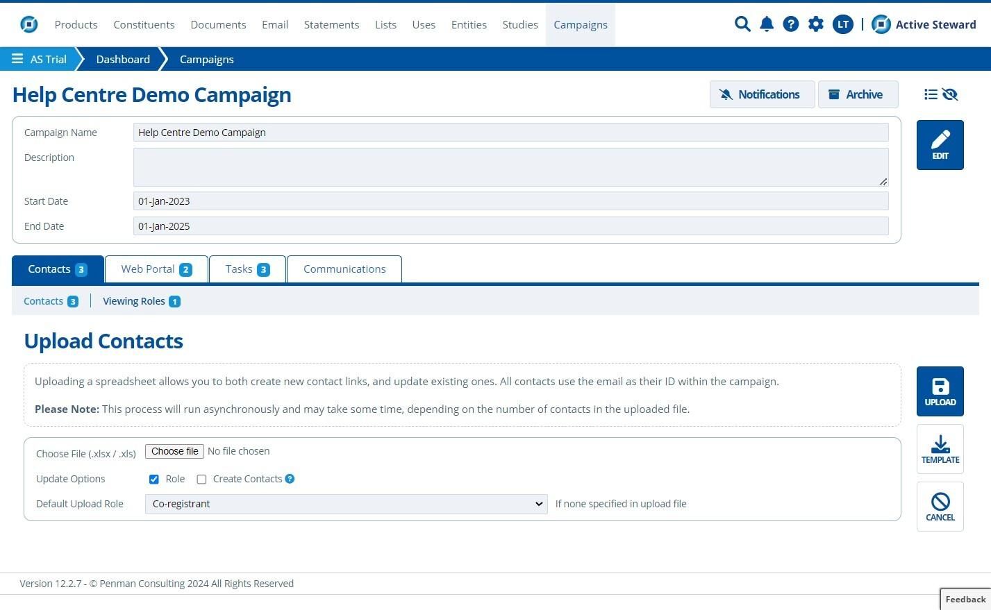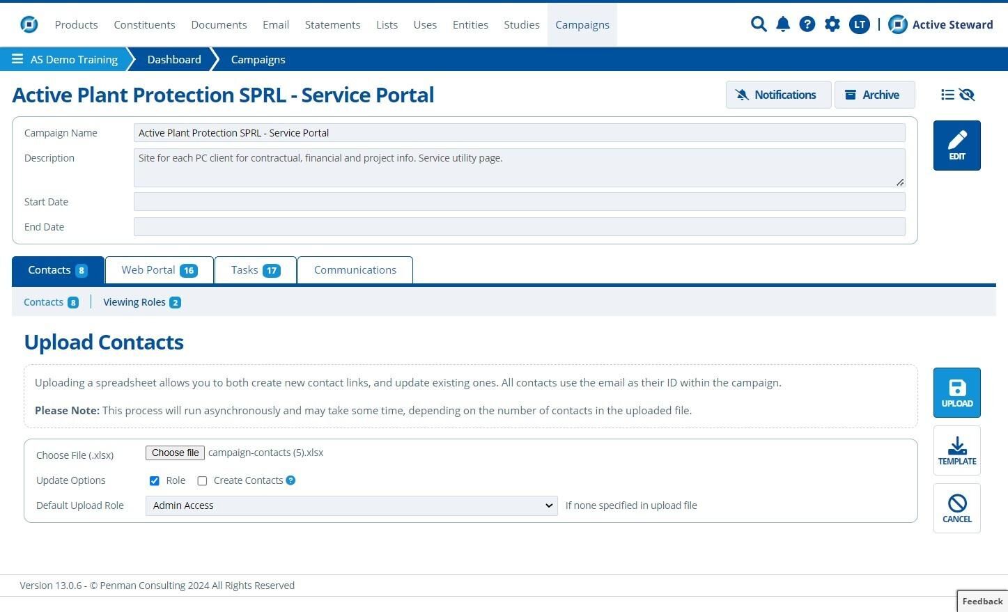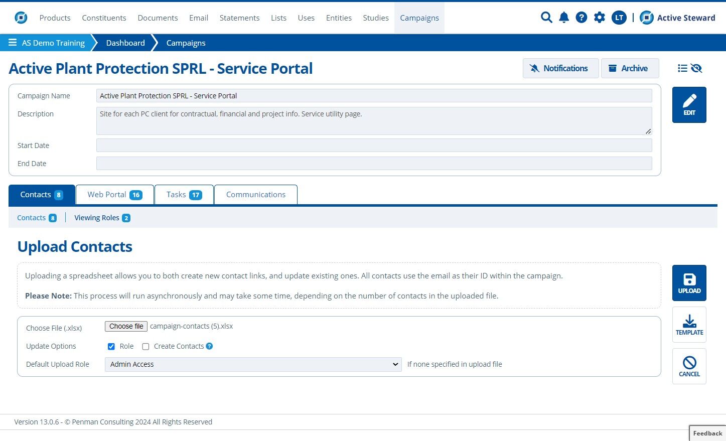 Contacts need to be added to a campaign (and assigned the relevant roles) to view restricted pages. Contacts / viewing roles can be new or already existing when bulk uploading / updating. This tutorial details how to update and upload within one campaign. To bulk update / upload to multiple campaigns in the partition, see Bulk Data.