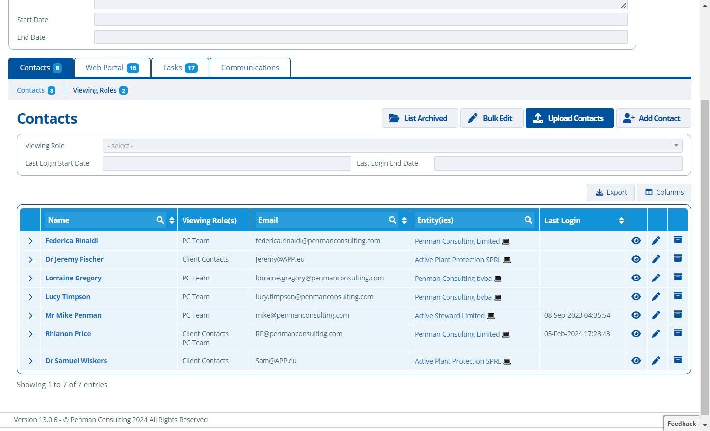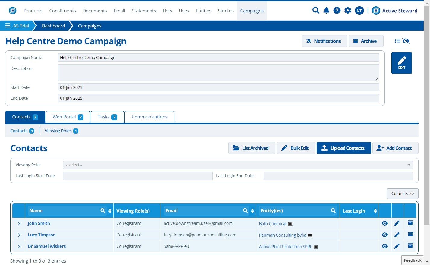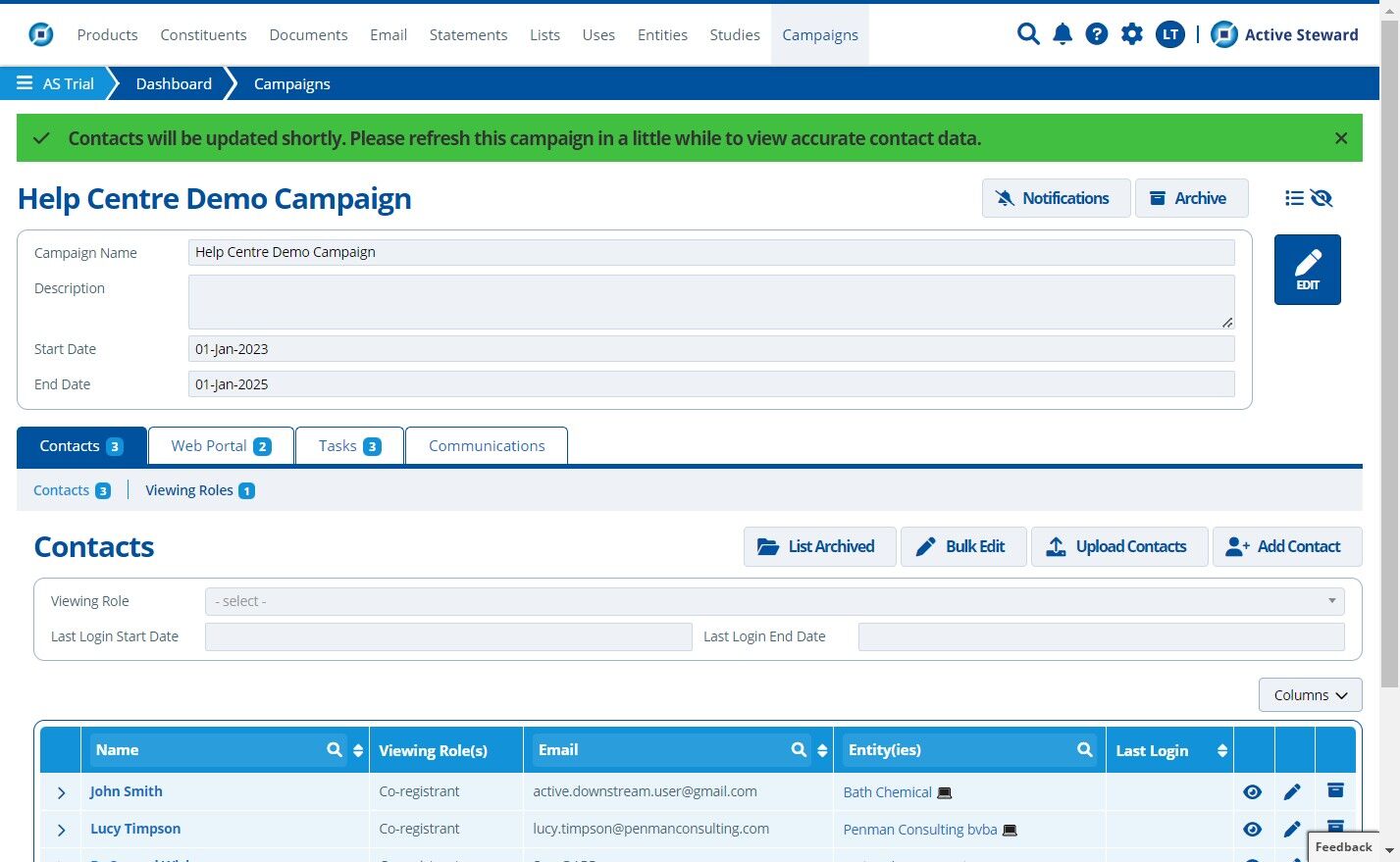 10. 🥳 The new contacts from the file are uploaded and assigned their viewing role(s) as expected. The existing contact has also been added/assigned to the campaign.¶