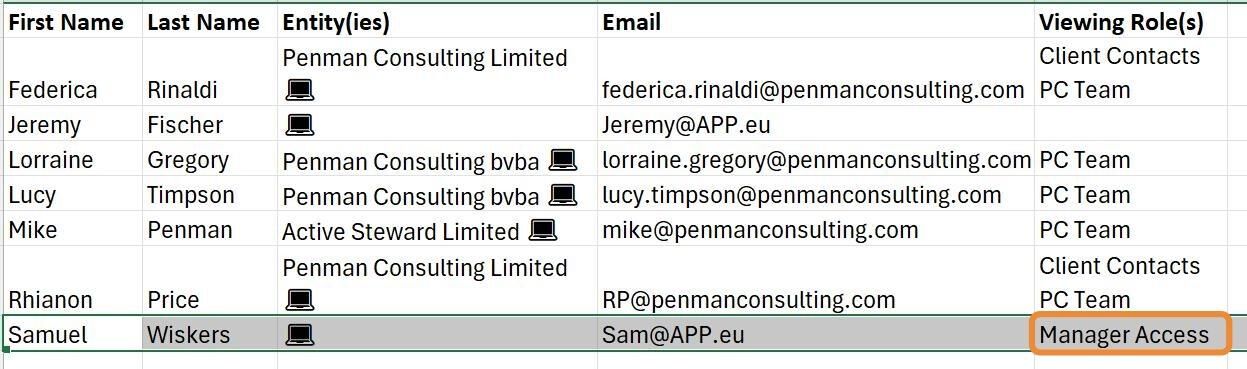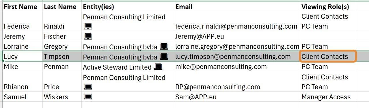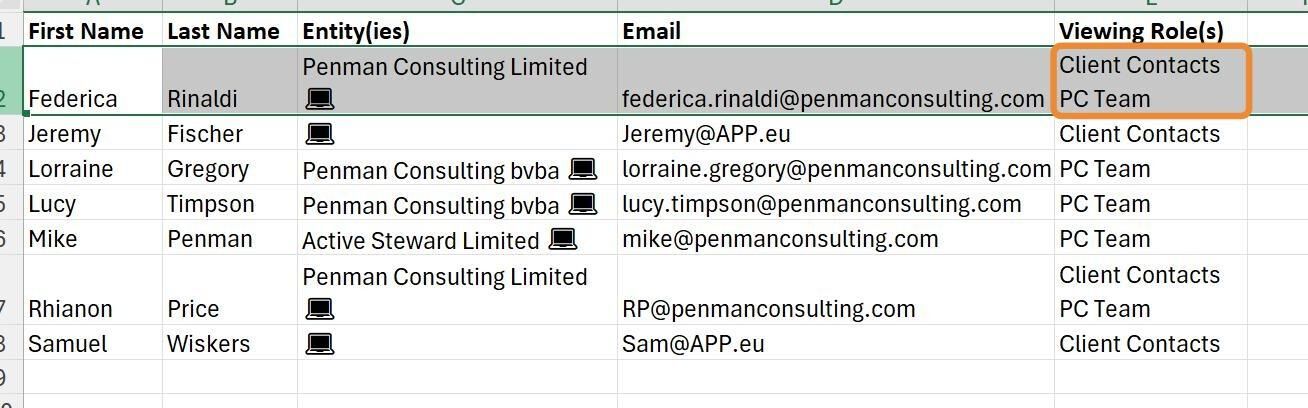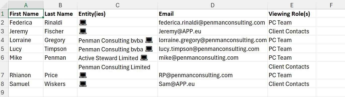 Here is a preview of the upload file. Contacts and viewing roles can be new or already existing. The entities must already exist. The contact is determined by the email address given, so this must be unique (not already existing in the system). Multiple roles can be put into the "Viewing Role(s)" field - each separated onto a new line.