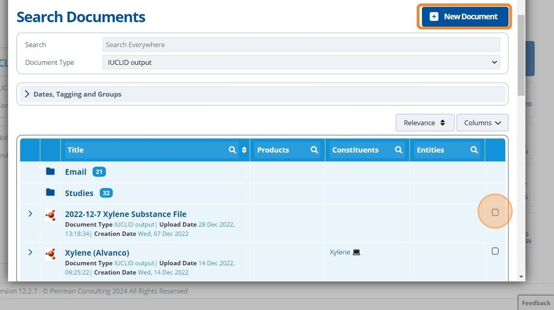 7. 👆 Click "New Document" if the IUCLID file is not yet in the system and 📤 upload a file. If the IUCLID file already exists in the database, then 👆 select the checkbox for the relevant file in the table.¶
