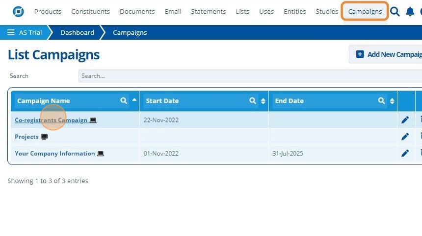 1. 👆 Navigate to Campaigns 👉 Select the campaign of interest from the list.¶