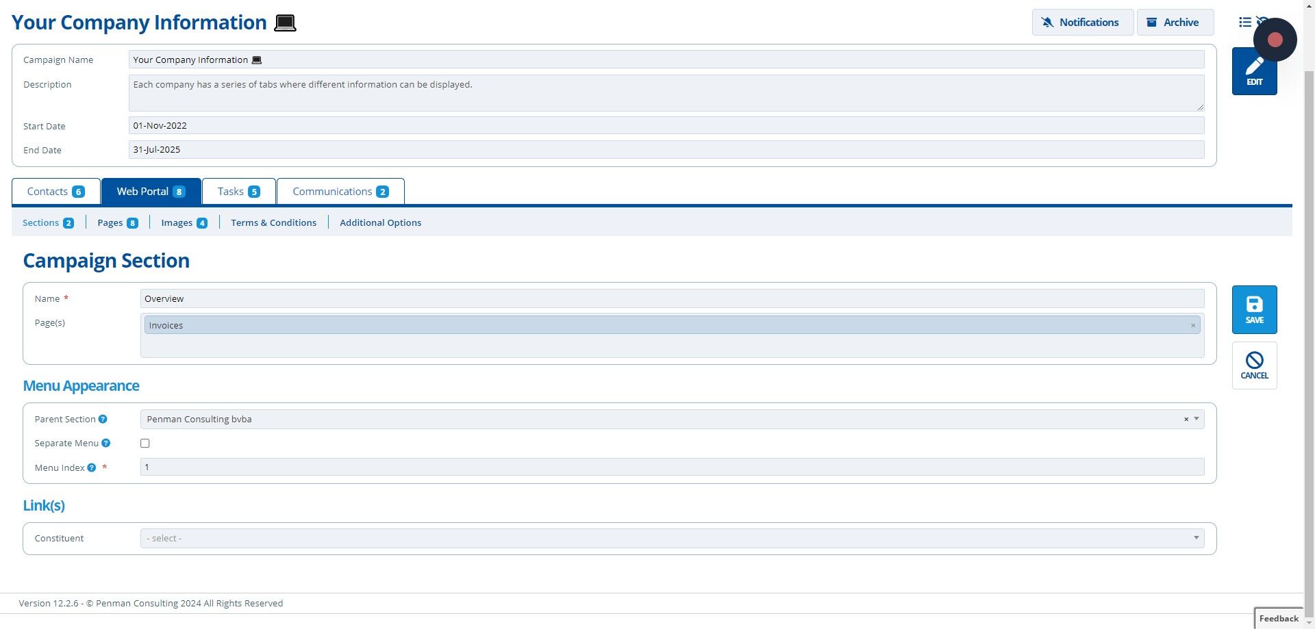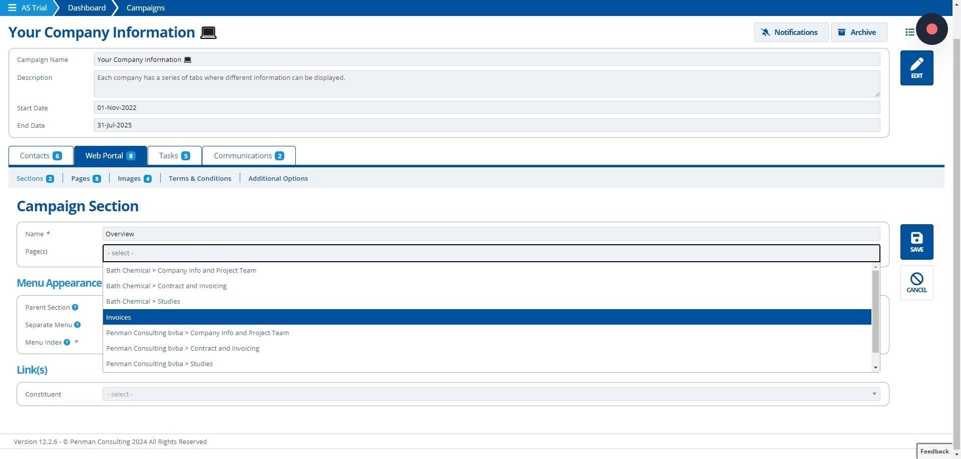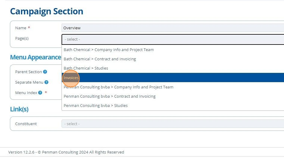 Sections are used to organise campaign pages into groups to improve the menu appearance and make navigation easier for the user.
