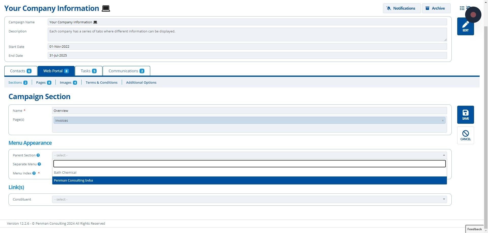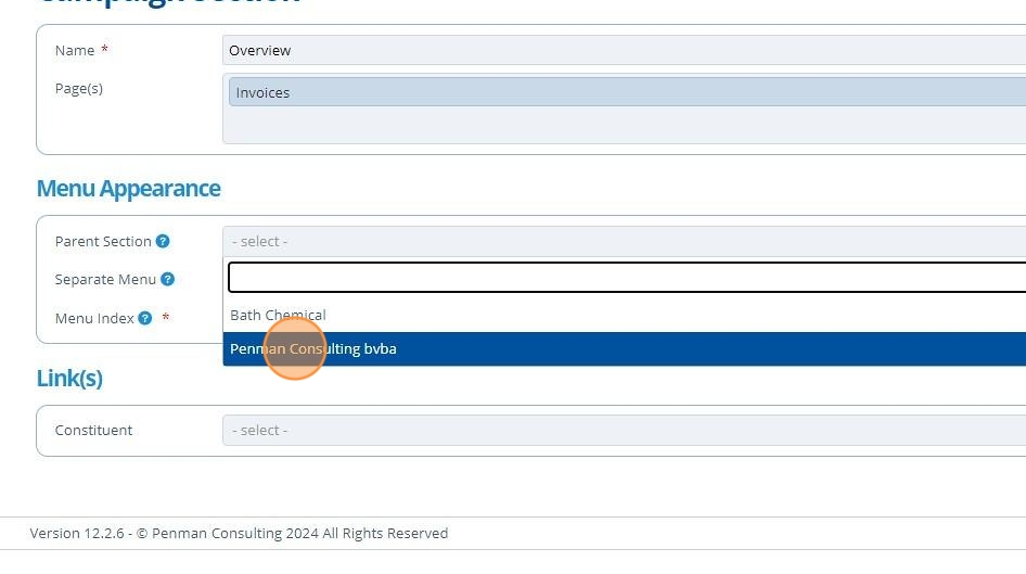 Selecting "Separate Menu" will display the menu in a separate block below the main campaign menu. The index determines where in the menu the section is displayed in relation to other sections at the same level. The order is ascending. If multiple sections have the same index then the order is done alphabetically.