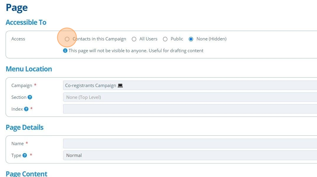 4. 👆 Select an option in the "Accessible To" section. This will control who can see the page.¶