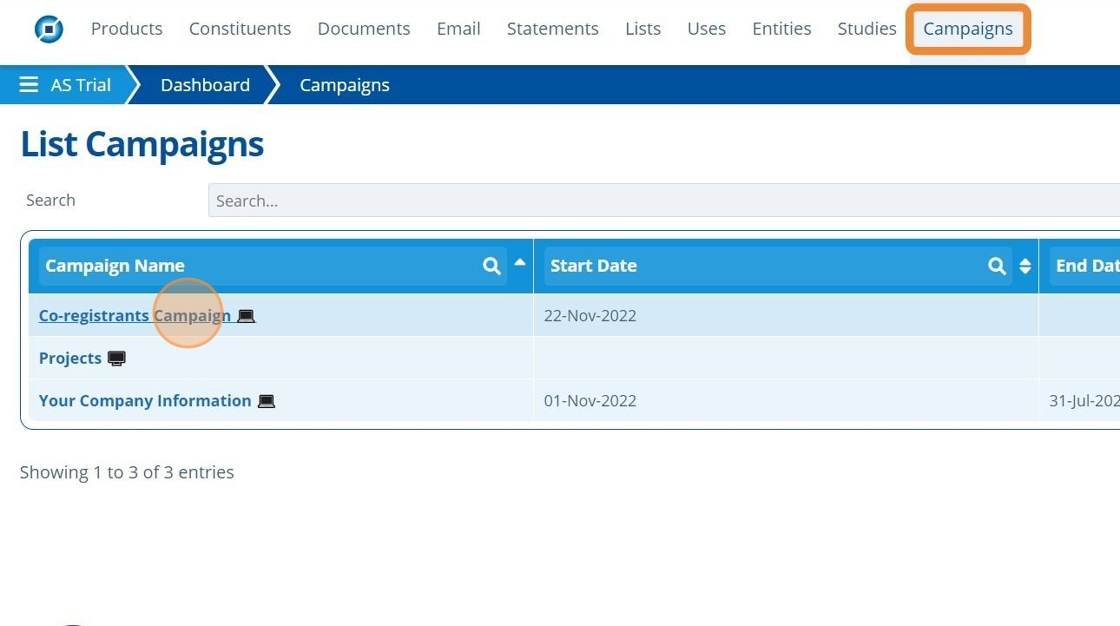 1. 👆 Navigate to Campaigns 👉 Select the campaign of interest from the list.¶