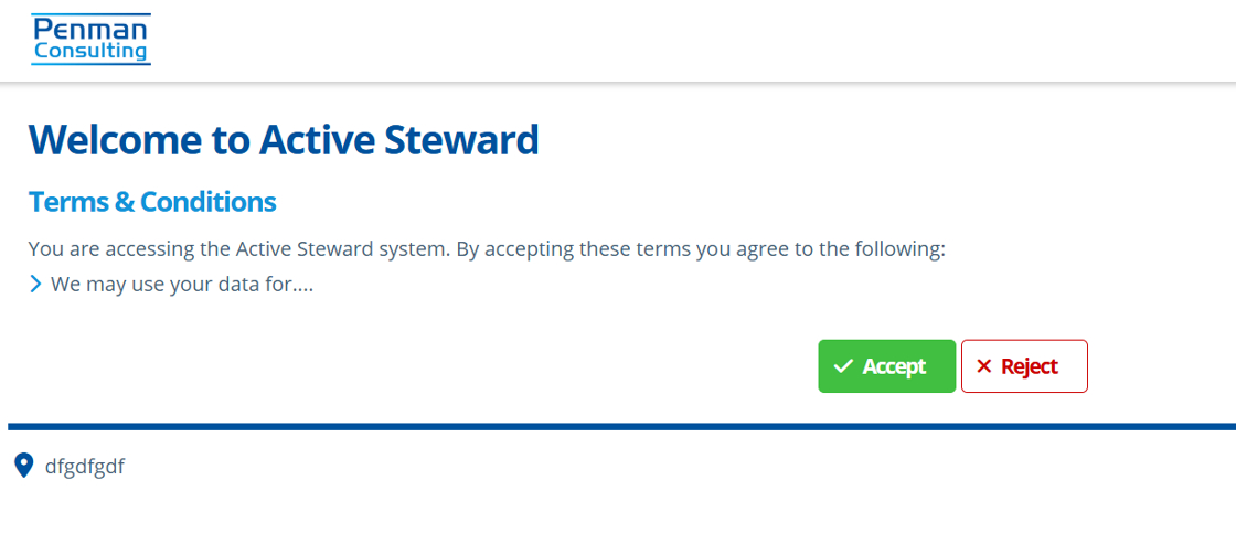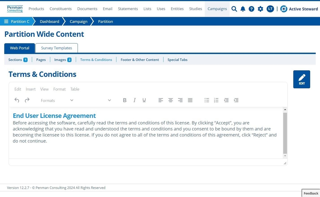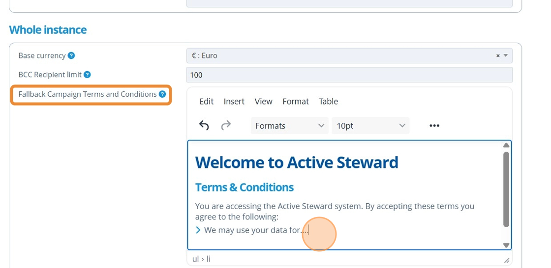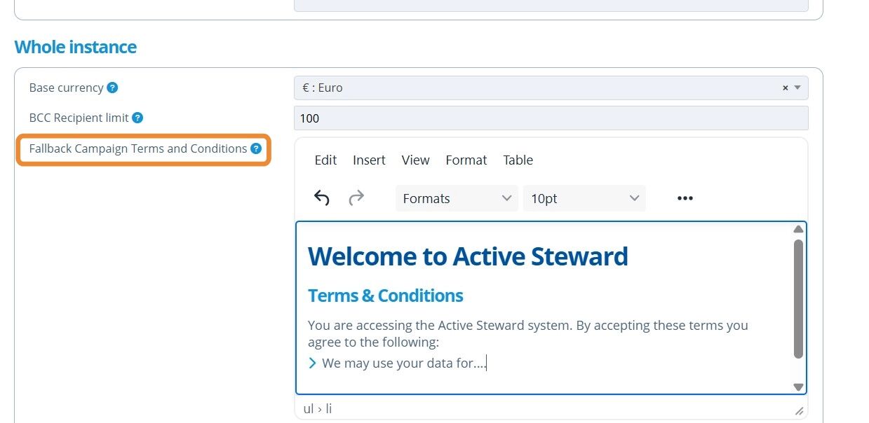 Terms & Conditions can be added for a whole instance, a partition and individual campaigns. The partition level T&Cs are shown to users upon login (see preview below). Campaign level T&Cs are shown to users when accessing campaign pages and are the most specific terms. Instance level T&Cs are used as a "fallback" option where there are no partition wide terms set up for a partition. Instance T&Cs can be applied to all partitions within the instance, so are the most general.
