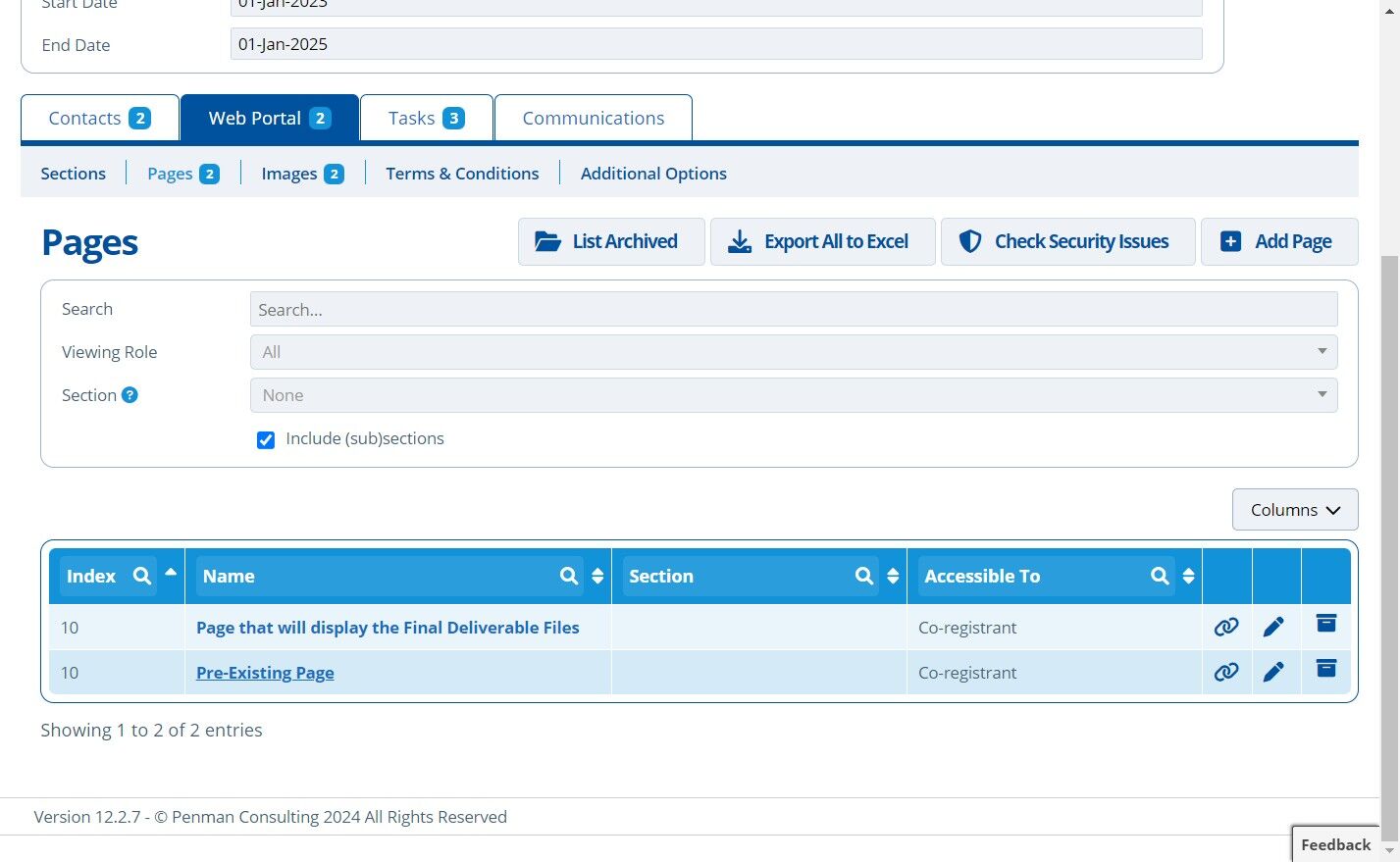 Only tasks that are accessible in line with the page permissions are inserted to the page.