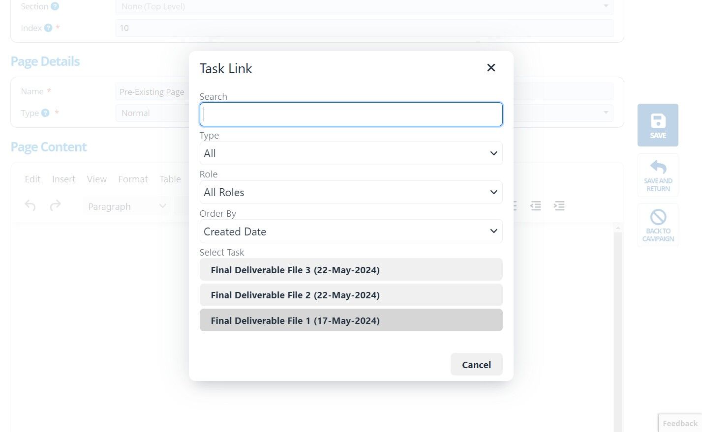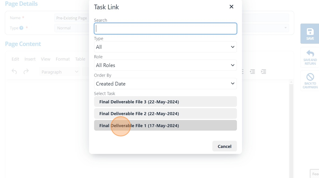 5. 👆 Select the task you would like to add to the page from the list. Use the "Type" and "Role" filters or search by task name.¶