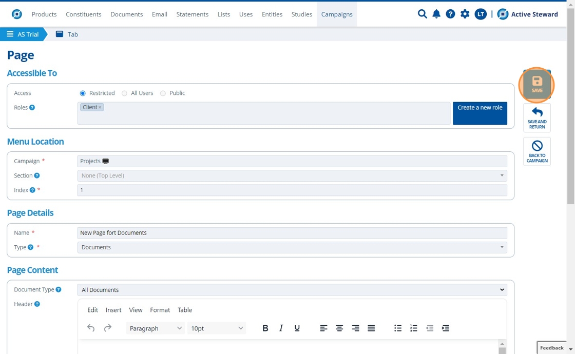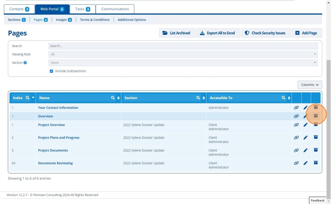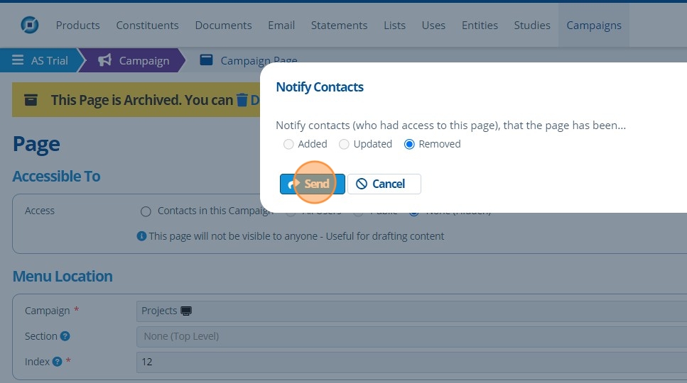 8. 👆 Click on the archive button next to the page to be removed. Note that the page remove notification can only be sent if the page is currently archived.¶