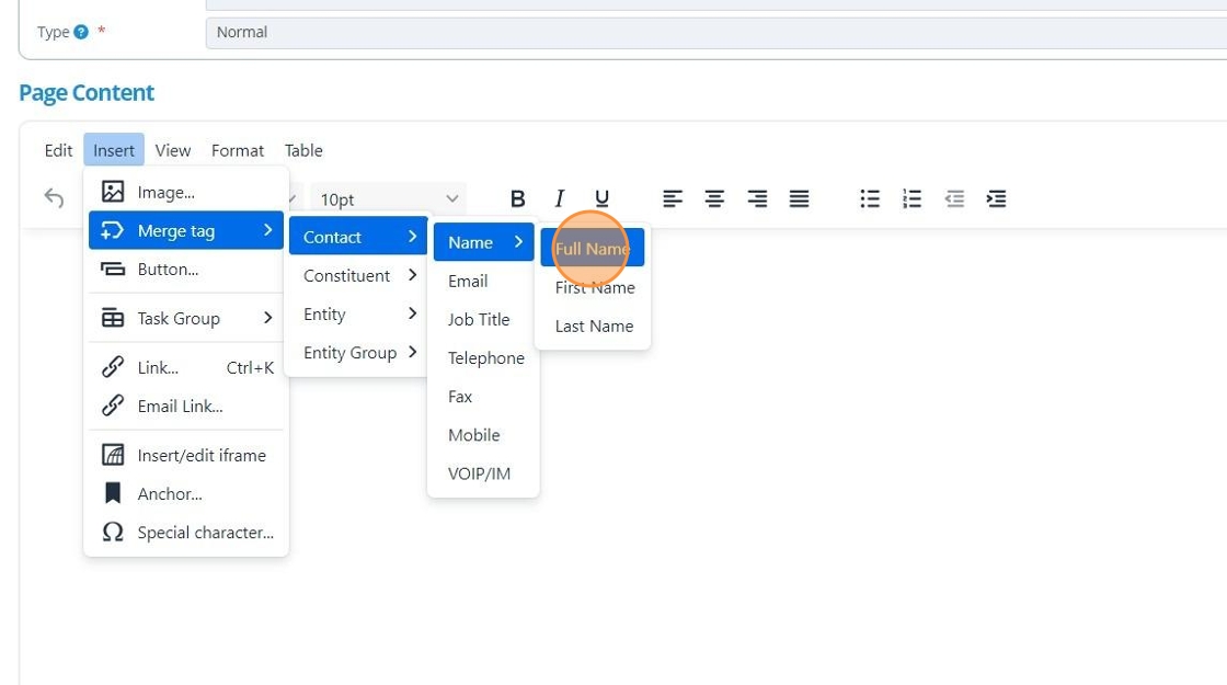 2. 👆 Click "Insert" 👉 "Merge tag" and 👆 select an option from the list.¶