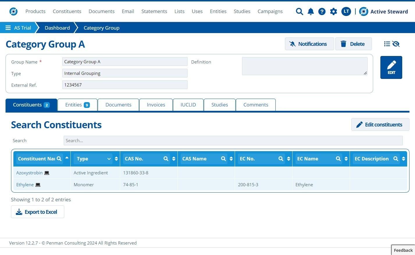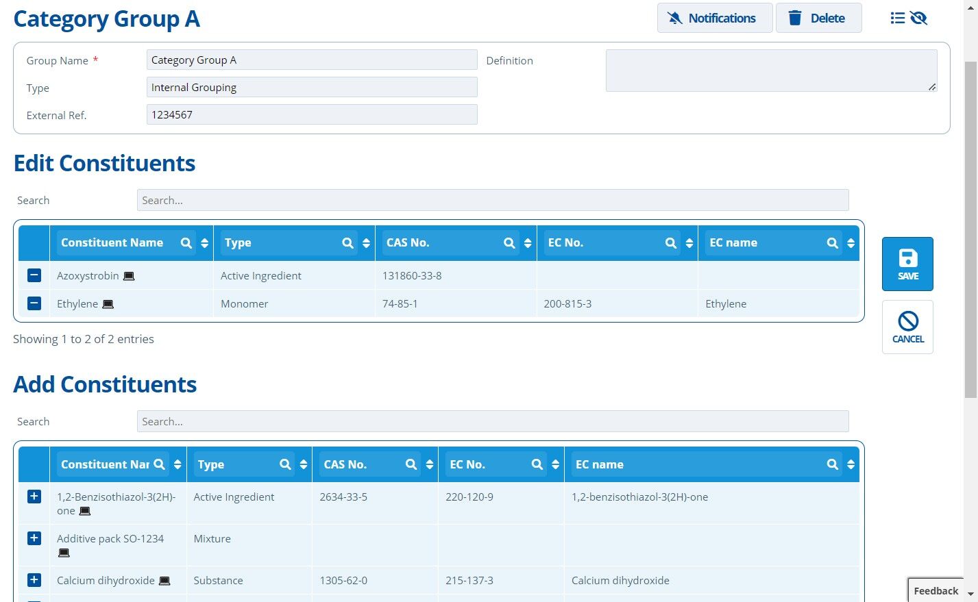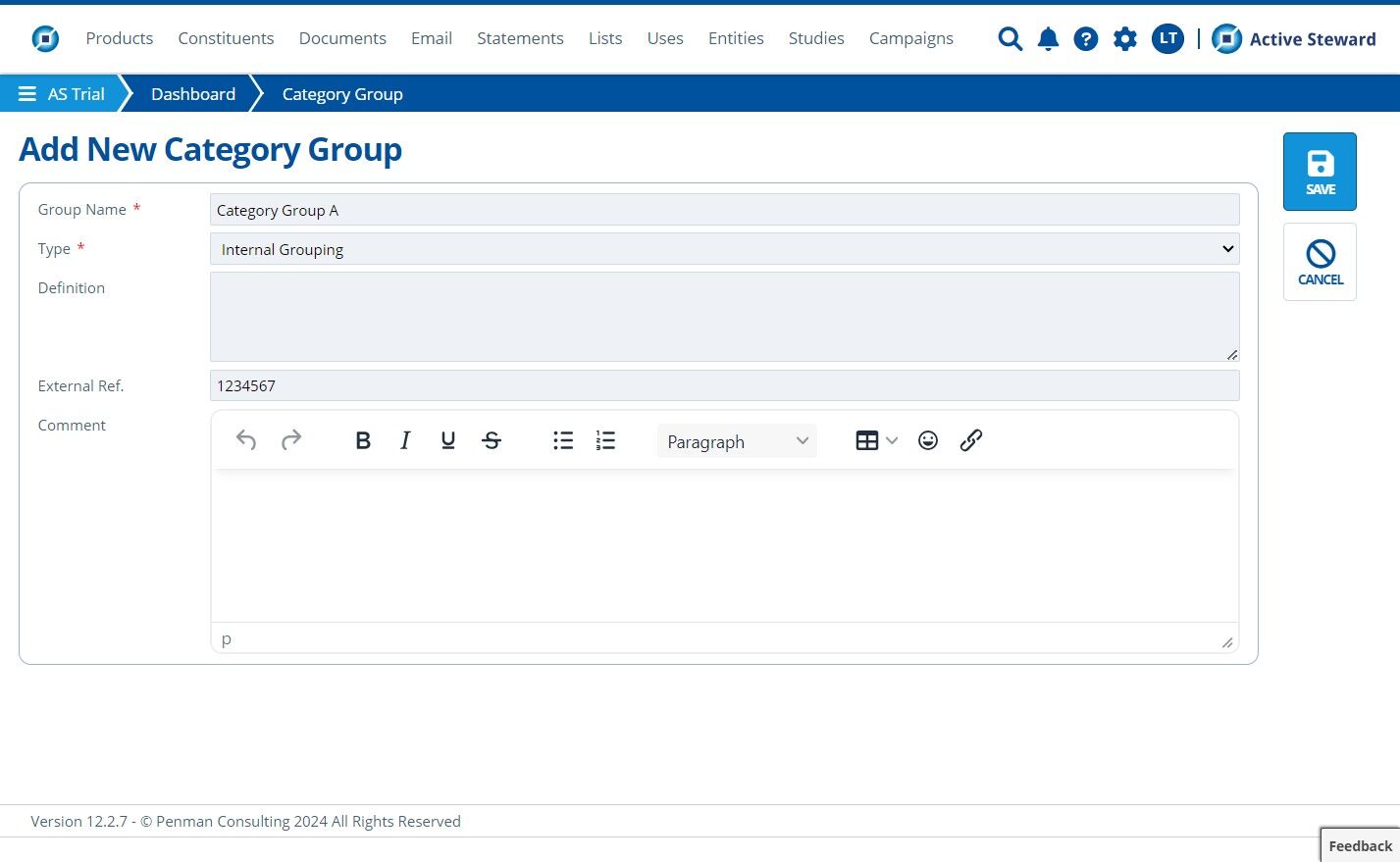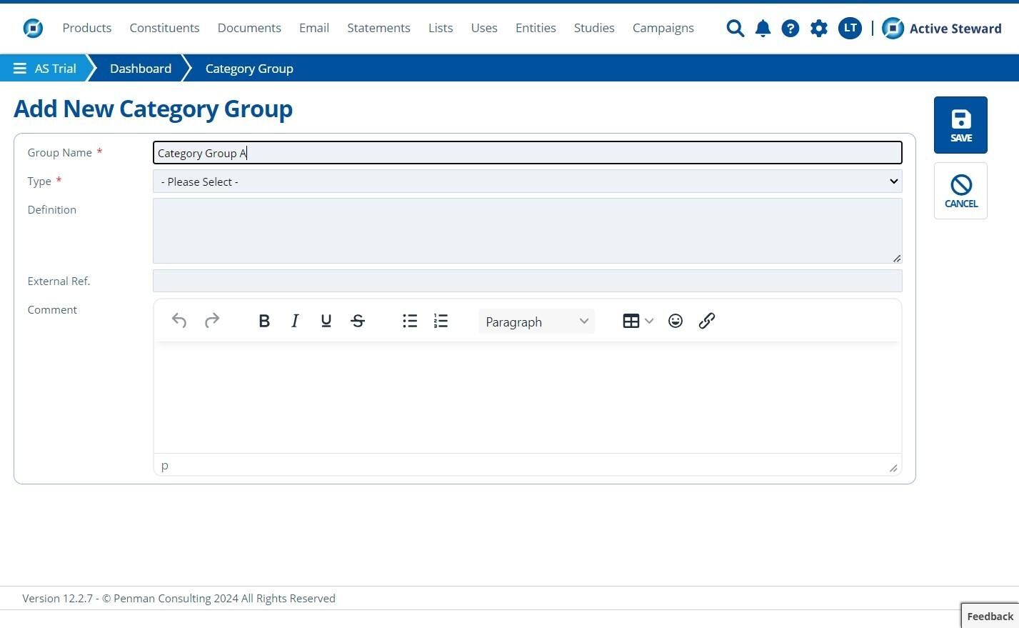 - Category groups are used to group together constituents. They can be associated with documents, budgets and studies. This is helpful as it allows a lot of constituents to be linked to a record quickly.