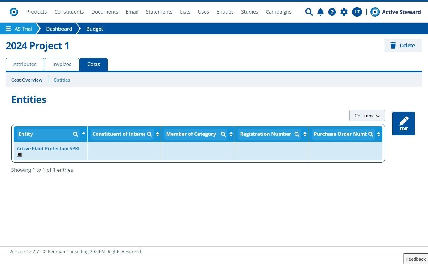 The cost overview is a summary of the budget costs - it also shows how the budget is split between entities. The overview can also be used to generate invoices using information in the table.