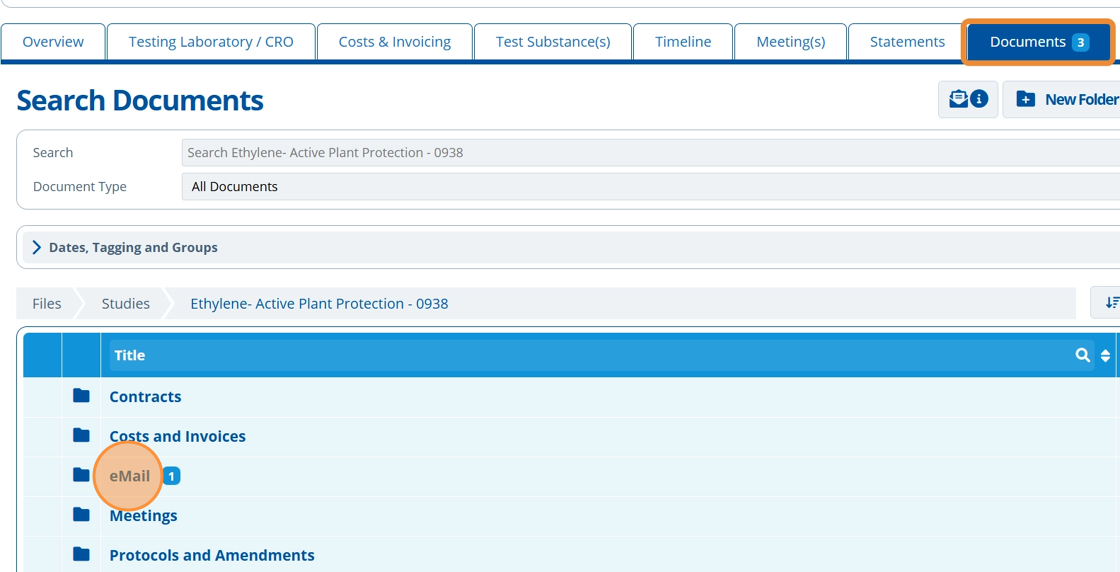 7. 🥳 The email and attachment(s) are saved and are linked to the study record. They can be found on the "Documents" tab. The corresponding email can be found inside the "eMail" folder.¶