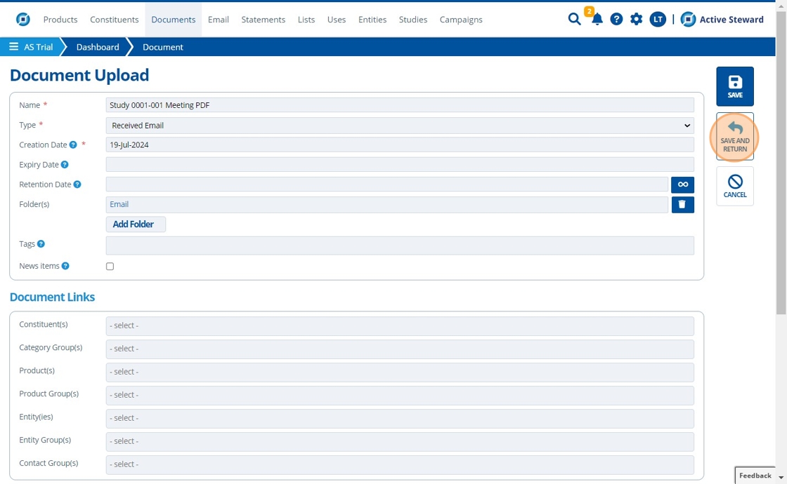 7. ✍️ Enter any document attributes, then 👆 click "SAVE AND RETURN".¶