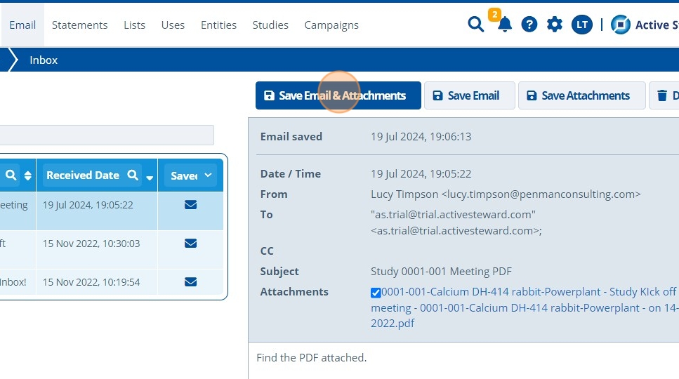 Clicking "Save Attachments" will store the documents attached to the email. It will not save the email itself.
