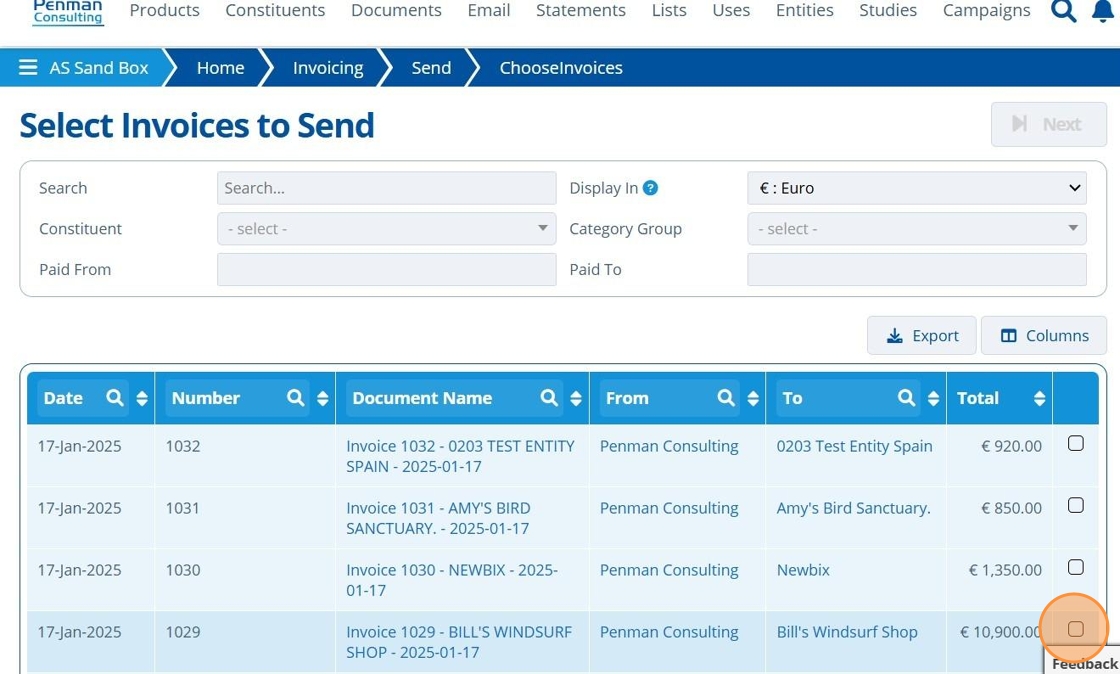 2. 👆 Use the checkbox to select an invoice to send.¶