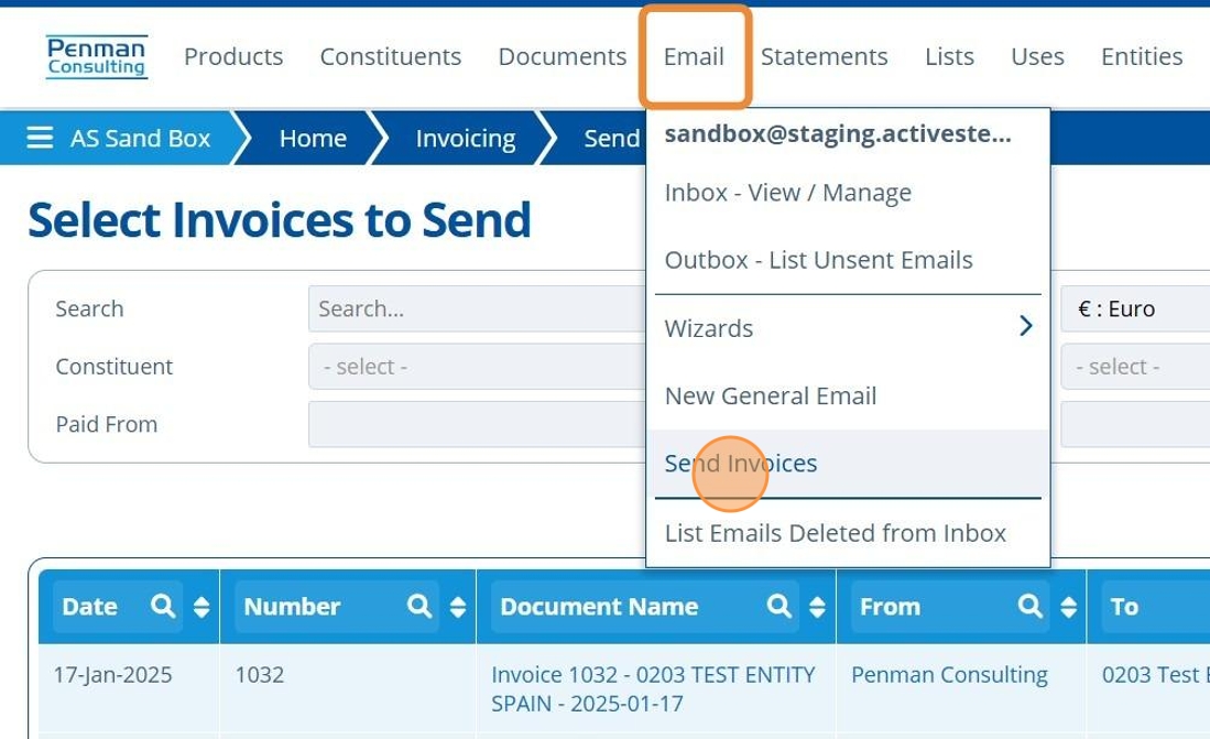 1. 👆 Navigate to Email 👉 Send Invoices.¶