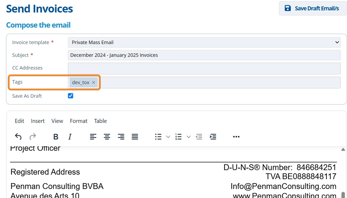 Once sent, the emails will be saved in the system as a document, with these tag(s) assigned. Tags are used to organise documents, making them easier to find when searching.