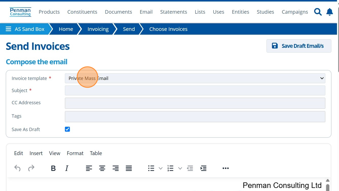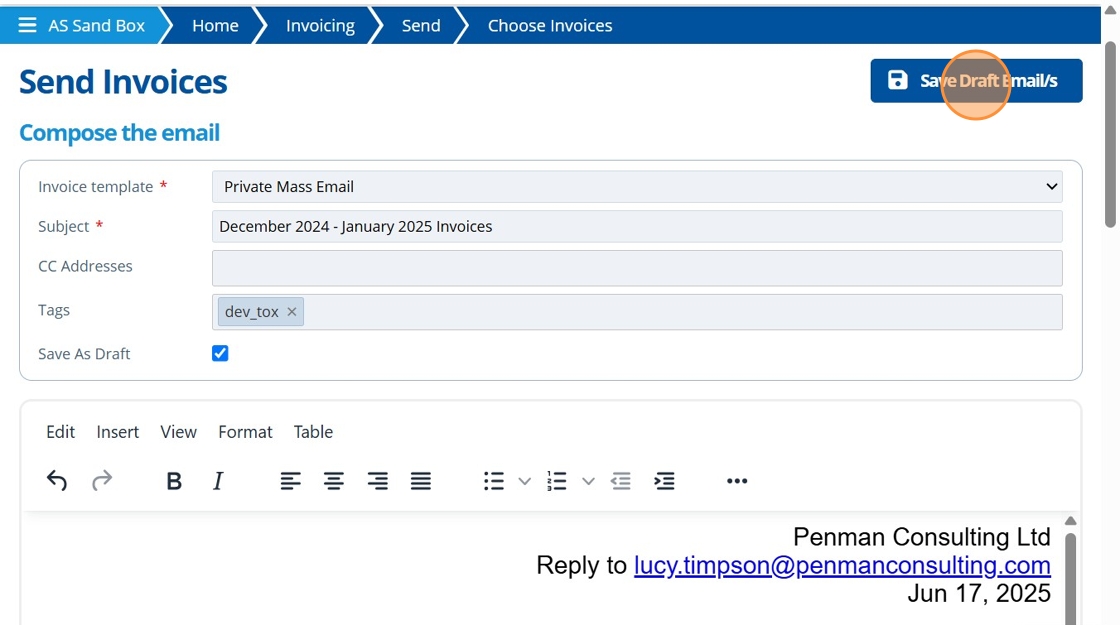 Invoices can be sent out to contacts using the "Send Invoices" wizard. Each invoice selected will be attached to an email. Steps on how to draft this email are shown in the tutorial below.