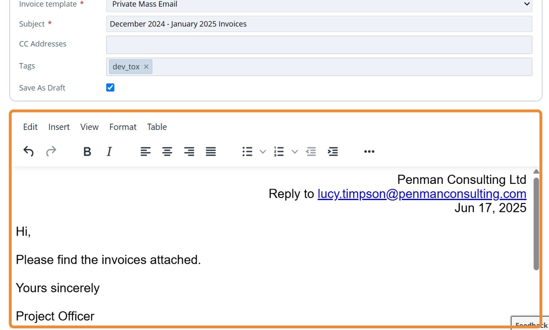 The email being drafted is sent out for each invoice selected in step 2. Each invoice will be attached to the email(s) as documents.
