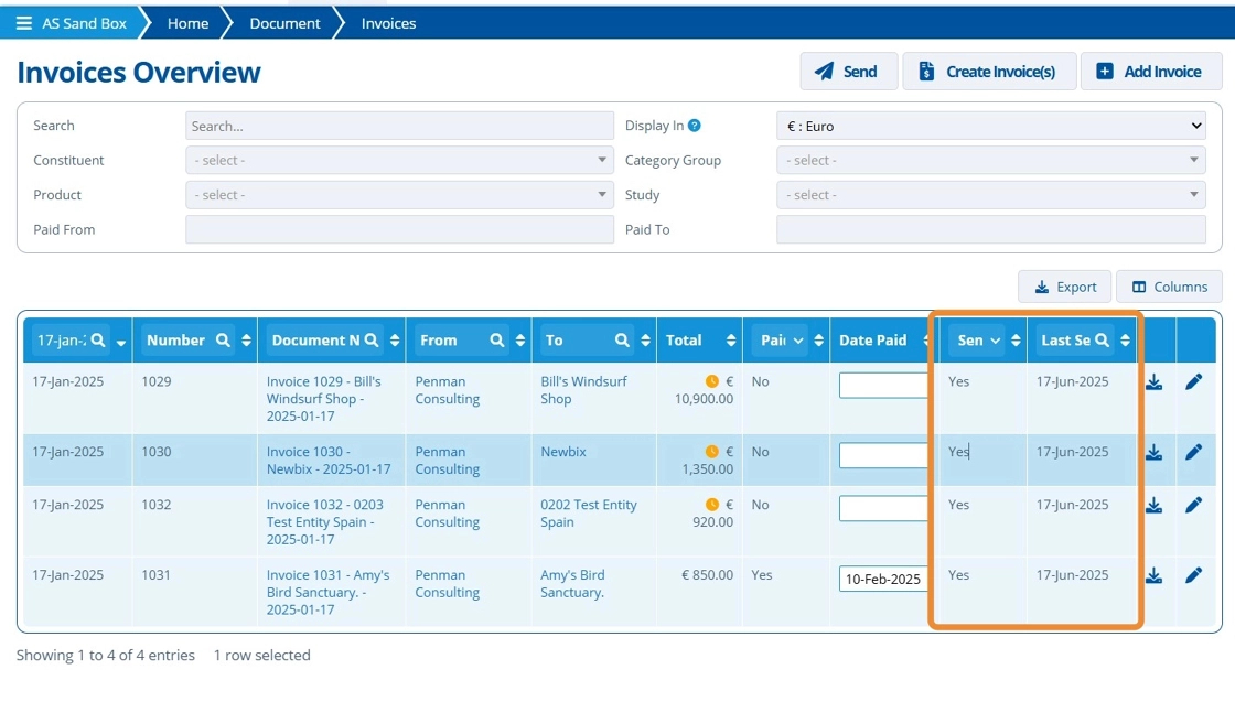 After sending the invoices out, the attributes for "Sent via Email" and "Last Sent" are updated. These attributes are found on the Invoices Overview and Send Invoices Wizard. This is useful to see which invoices have been sent out the system and when.