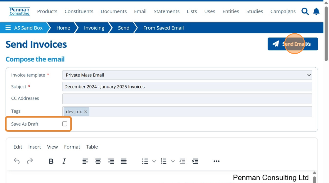 By default the "Save As Draft" option is checked. Untick this to send the email straight out to recipients. Otherwise, the email will be saved in the outbox and not sent. It can be returned to at a later time.