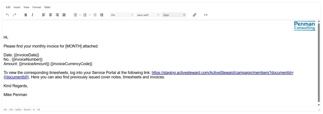 Some email templates include invoice attributes - shown with "{{" symbols. When the email is sent, these are populated using attributes from selected invoices.