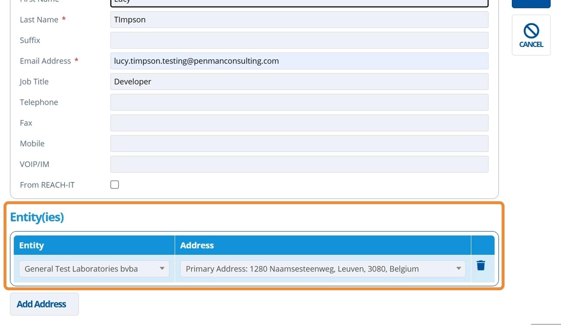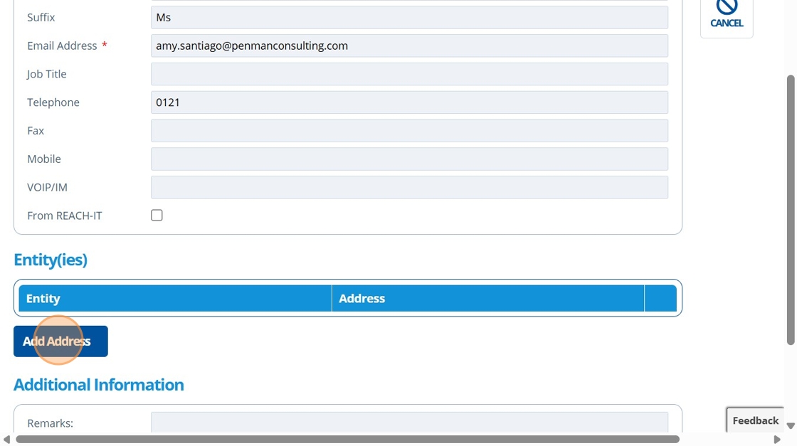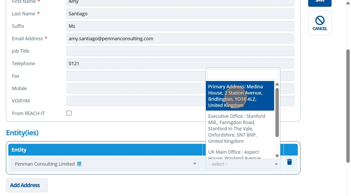 12. 👆 Click "Add Address" to assign the contact to an entity (optional).¶