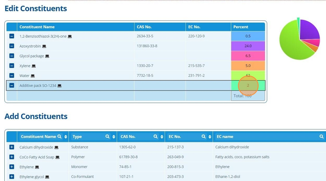 5. 👆 Click on the percent field for a constituent and ✍️ enter a new value to change the amount in the formulation.¶