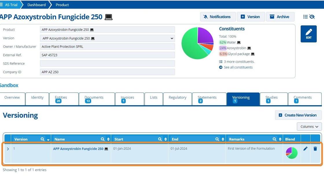 Before editing the formulation be sure to Create a Product Version. This is so the products formulation history can be saved. Previous versions can be switched to in the "Version" field.