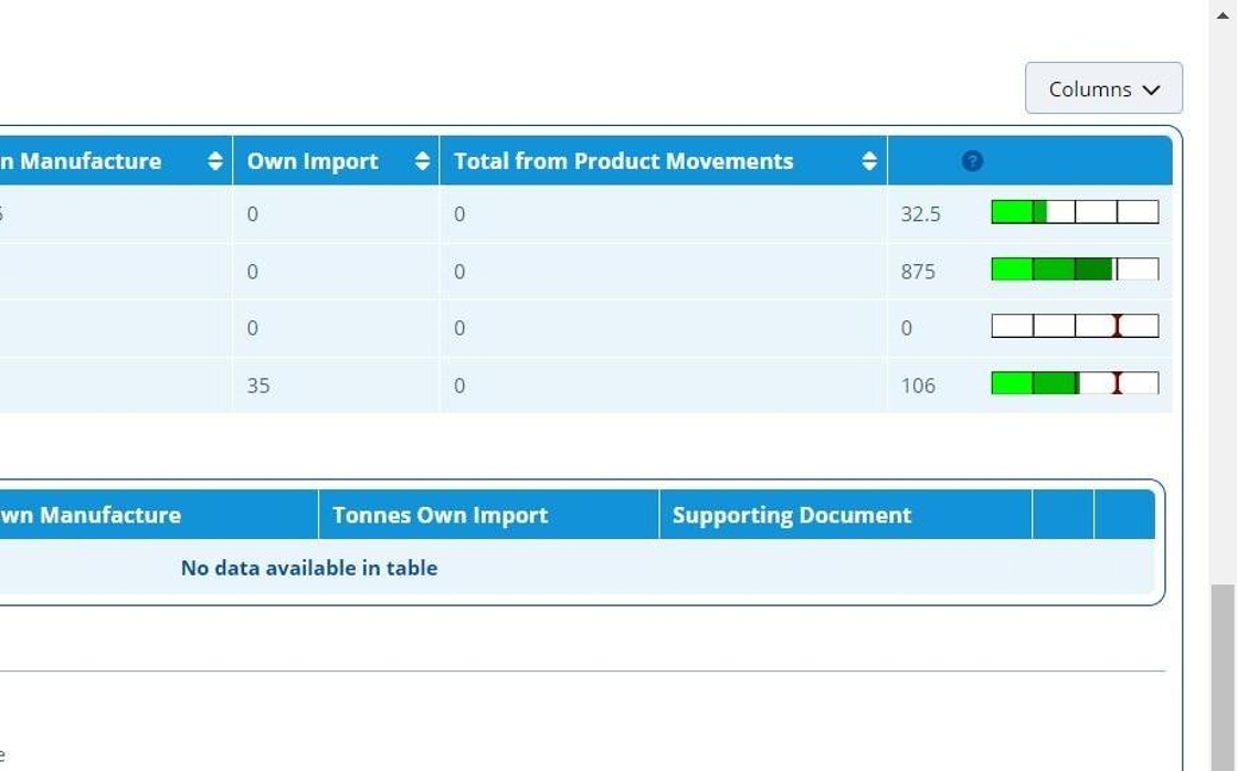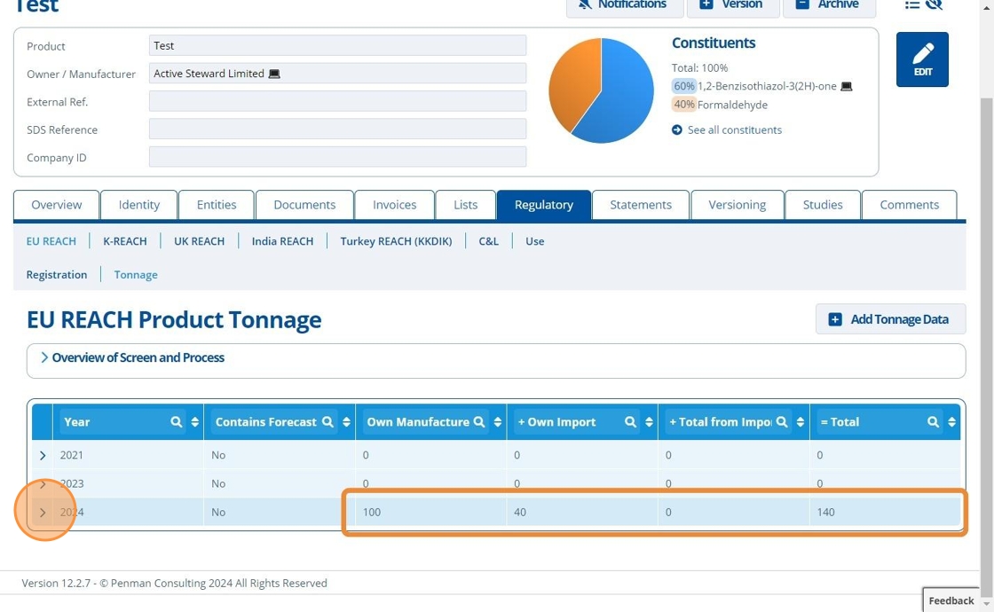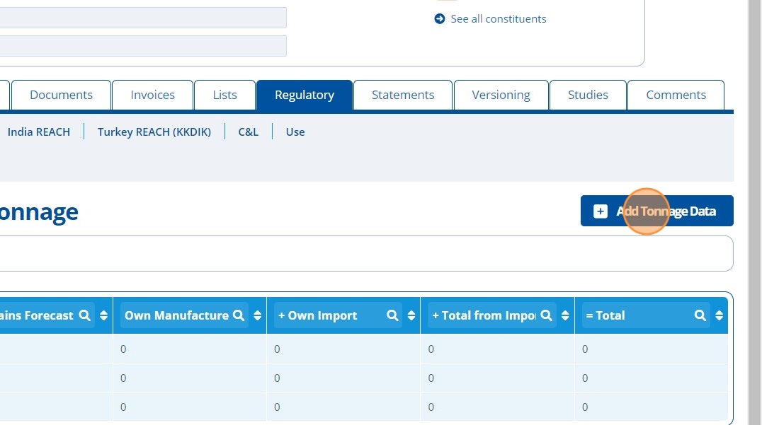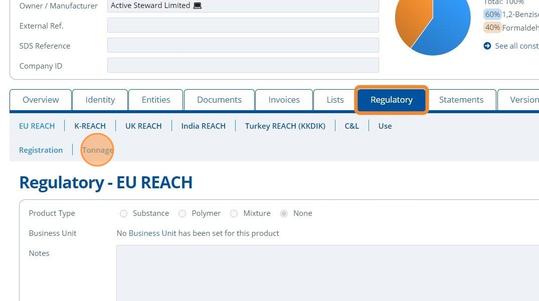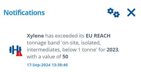 Tonnage bands in the "Regulatory" tab of a constituent record show how much of the band has been imported or manufactured so far by year. Warning notifications can be sent out when the constituent reaches the registered limit - this is to notify users that additional registrations may be required.