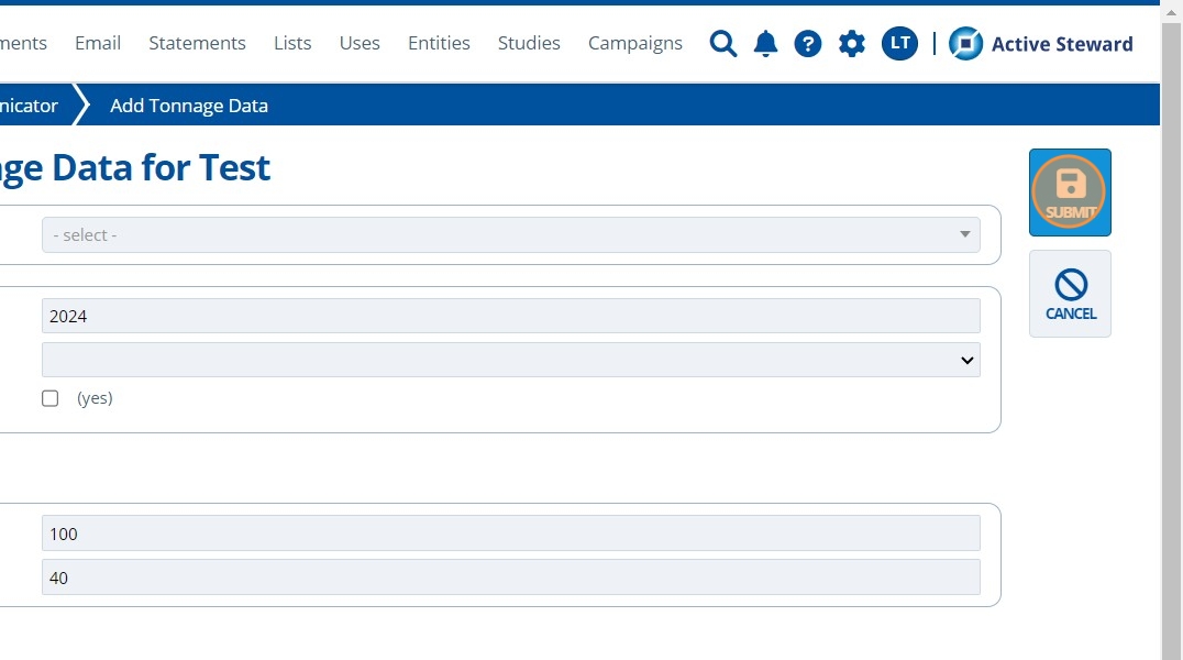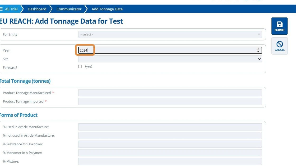 Tick the forecast box if the tonnage is a future estimate and populate the site if required - See Create Links between Substances and Entities.