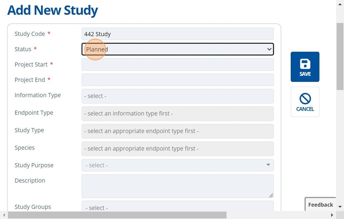 The "Status" notes the current progress of the study. Usually the initial status is set to "Planned". As the study progresses, the status is updated by users to keep all informed of where the project is currently up to. The order usually goes Planned → Contracting → Active → Complete.