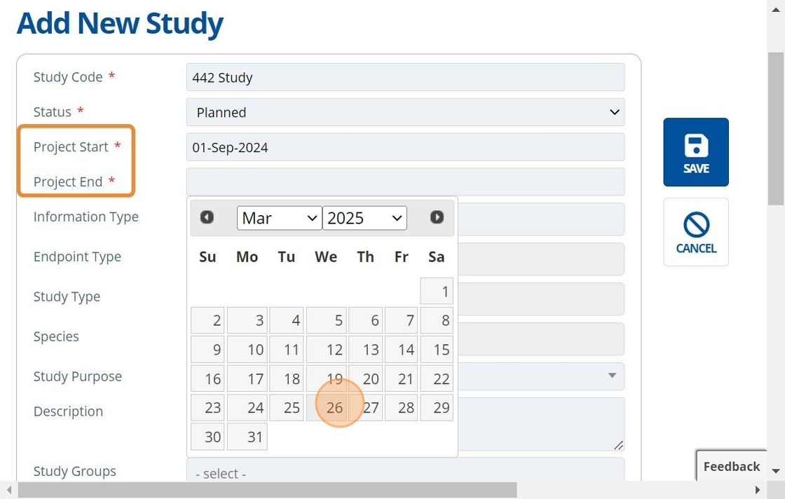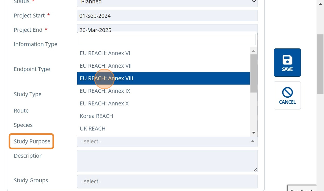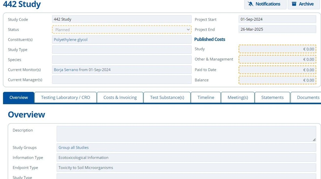 Project duration (Start to End date) is set wider than the study dates provided by a Contact Research Organisation (CRO/Lab). This allows time for planning and other study activities such as "Report Circulation". Specific study events and their dates can be set up on the "Timeline" tab which gives a more detailed overview of the whole project plan: Create Study Activities and Set up the Timeline.