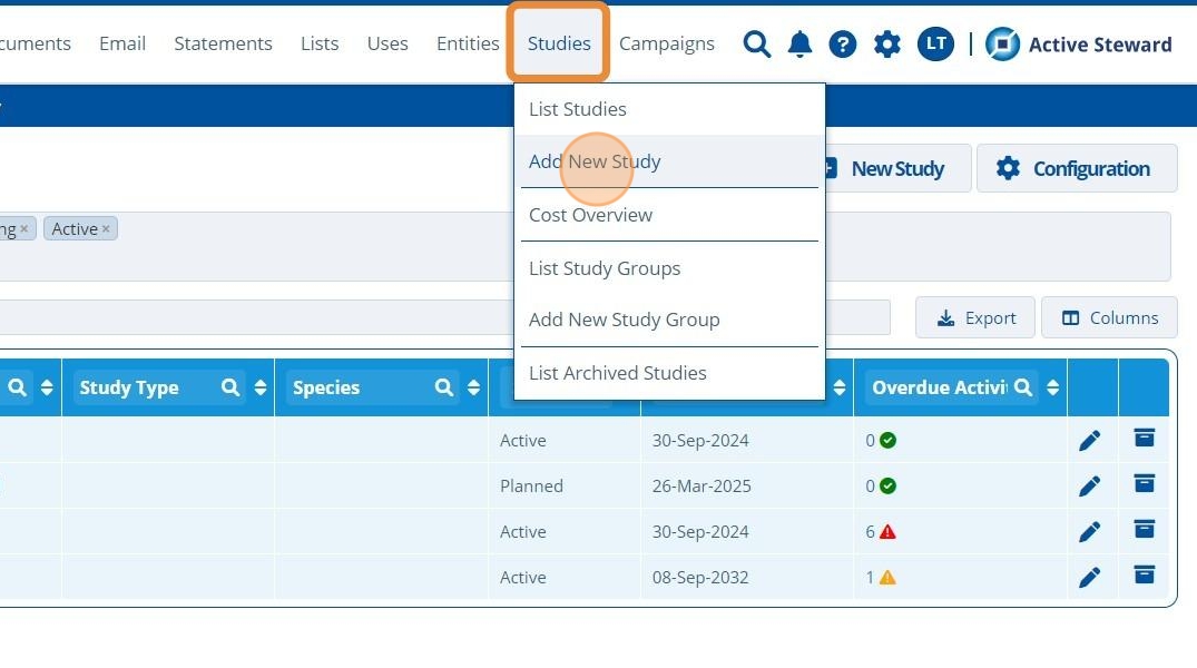 "Studies" in Active Steward are records that hold information about a study being conducted. Information held can be; finances / timelines / study details / documents. View the full study guide here.
