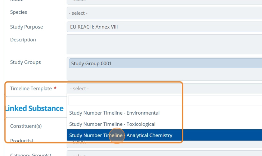 8. 👆 Choose a Timeline Template. The option selected determines the study timeline type shown for each study activity. The template chosen is based on if the study is toxicological environmental or analytical.¶