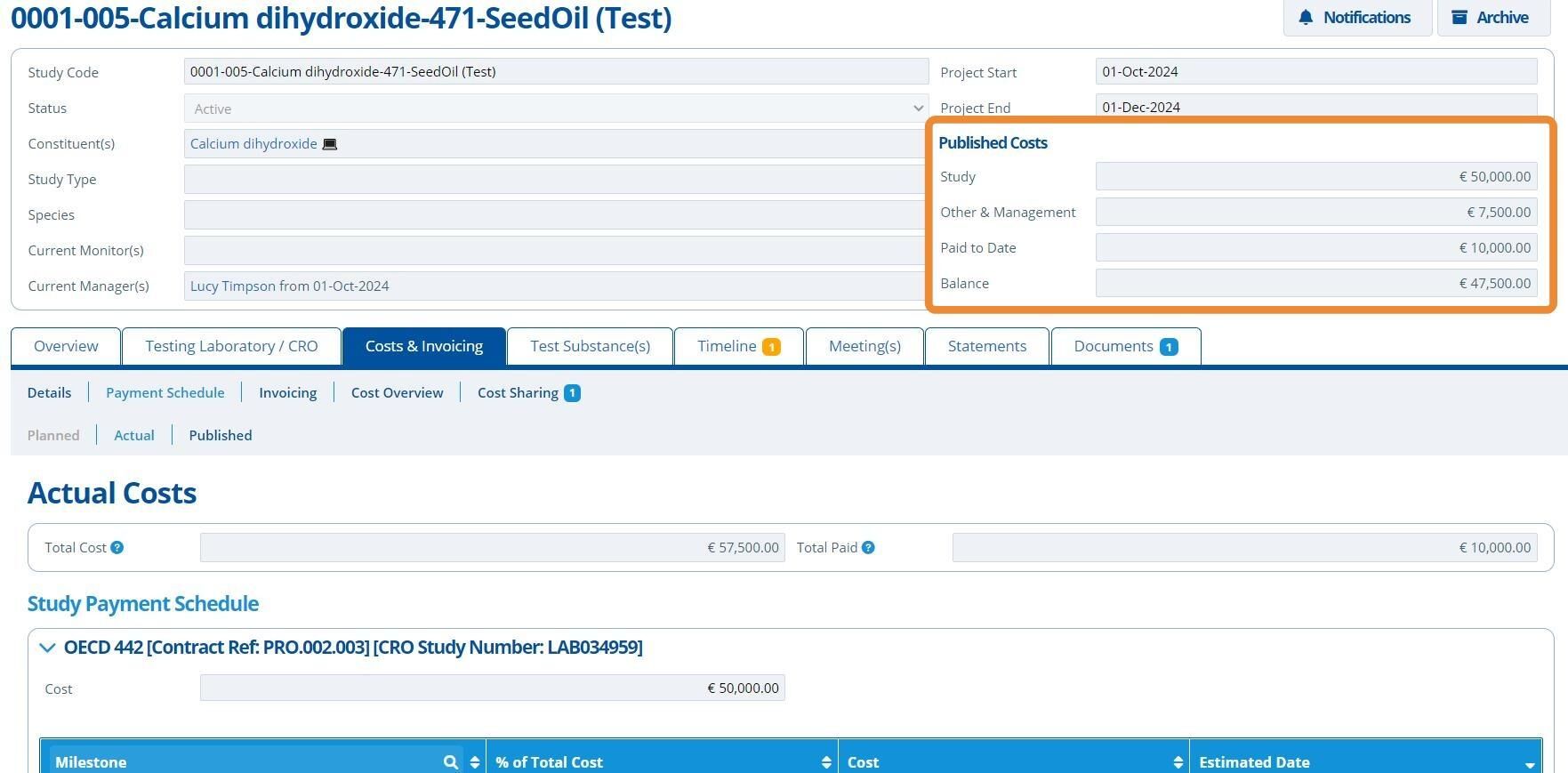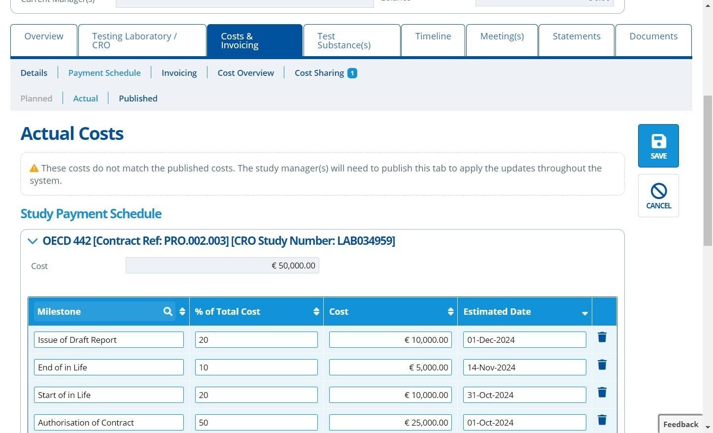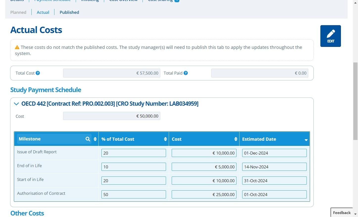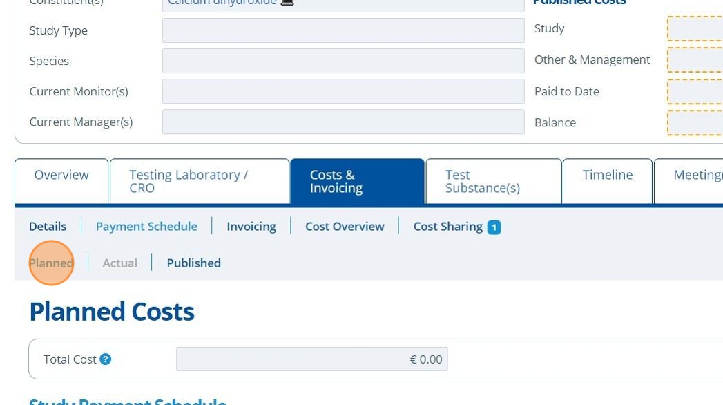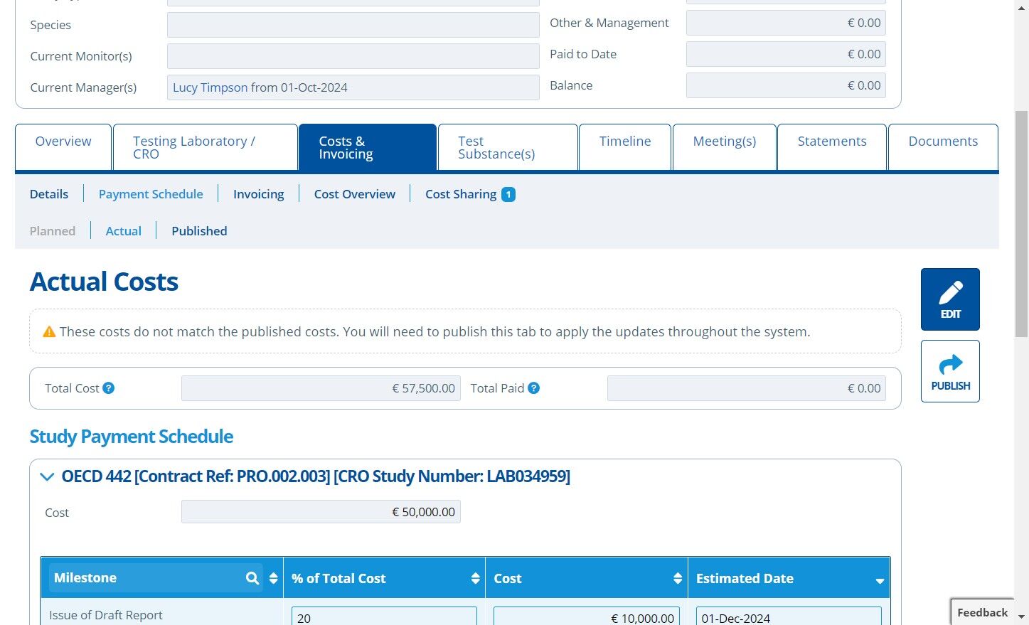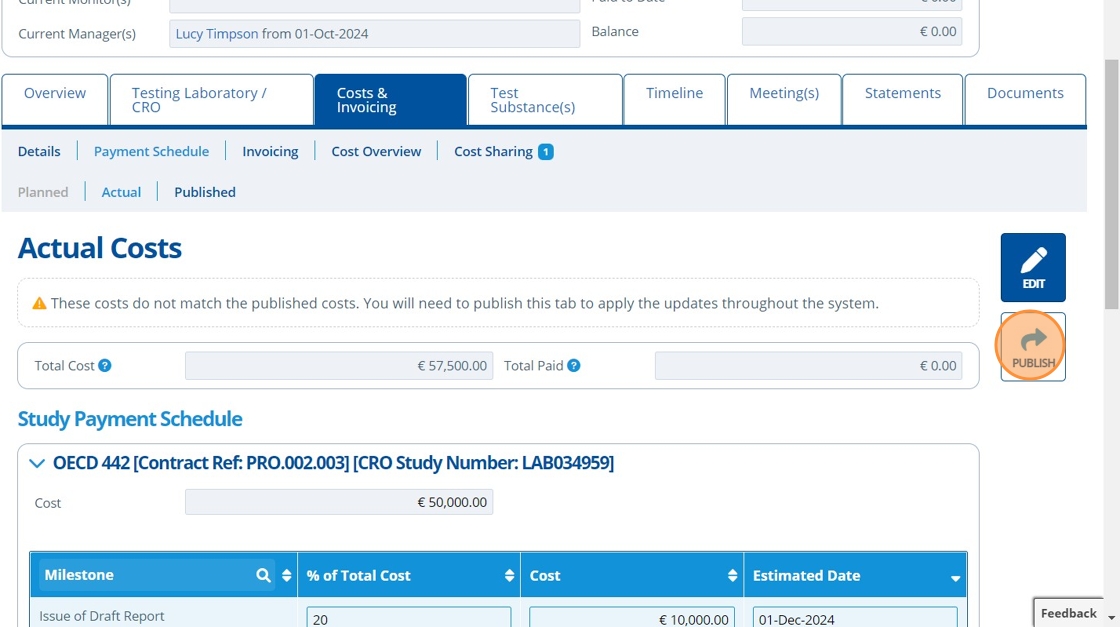 Publishing costs means that the costs and payment schedule for a study is finalised. Once costs are published it releases the information to be used in various other areas of Active Steward. Only the study manager is able to publish costs.