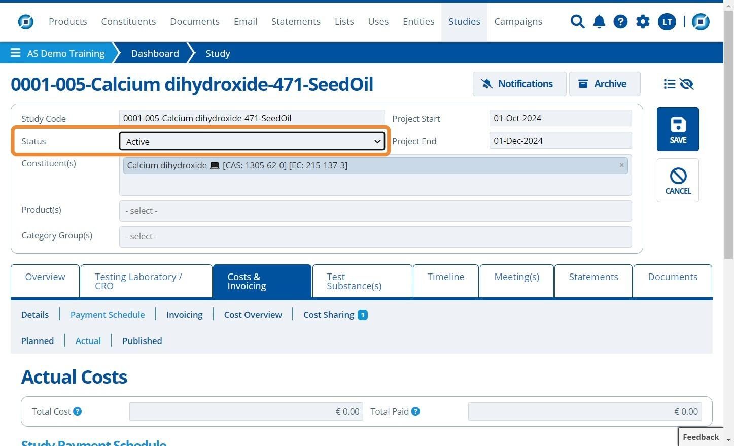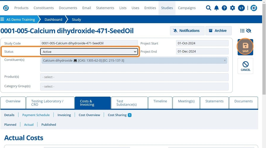 Now that the study is "Active" it is likely that the user has more information on the actual costs and estimated invoice dates - this information may be outlined in contracts received from the CRO.