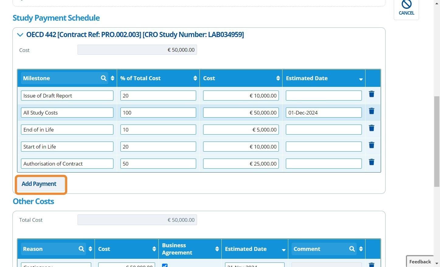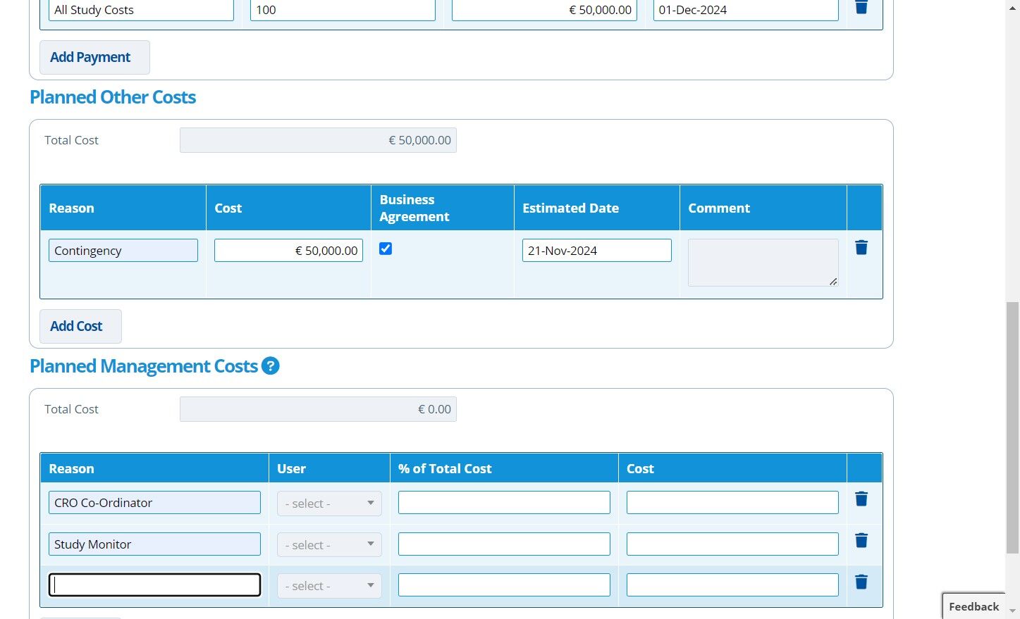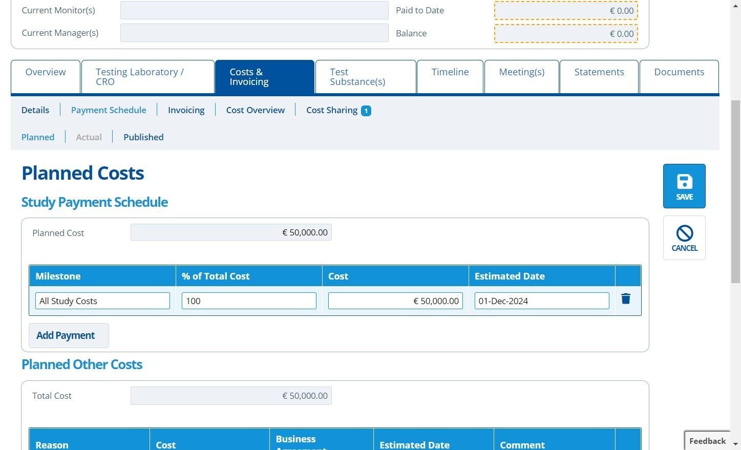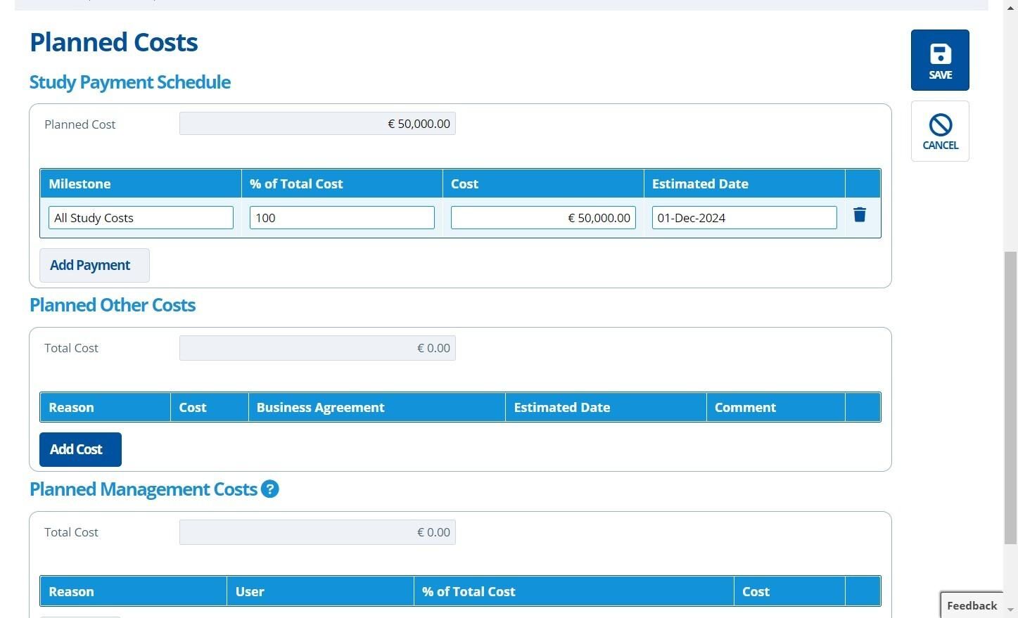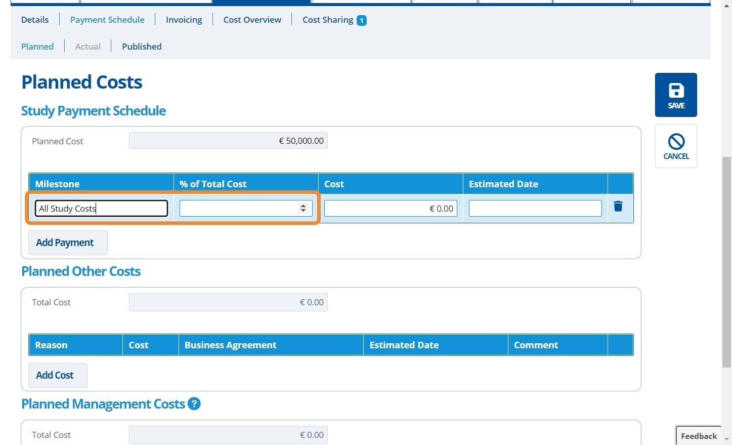 Each milestone represents a separate payment. All milestones will make up the full "Planned Cost" input in the prior step. When the study is at the "Planned" stage it can be hard to estimate costs and dates, so usually one milestone is added for "All Costs" as a placeholder.