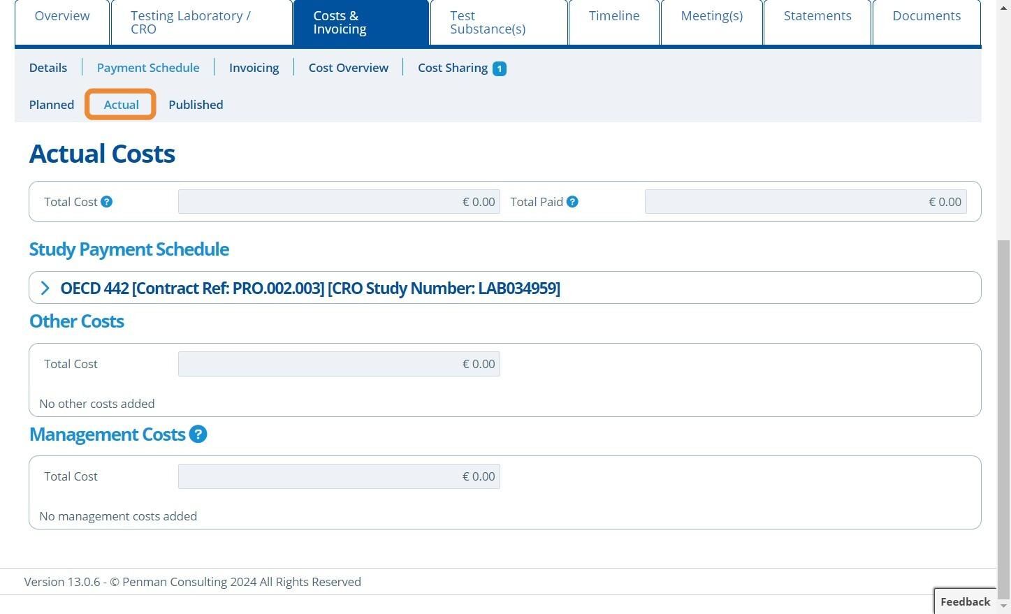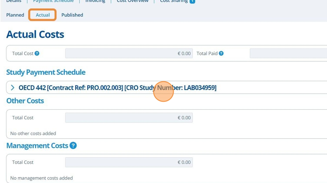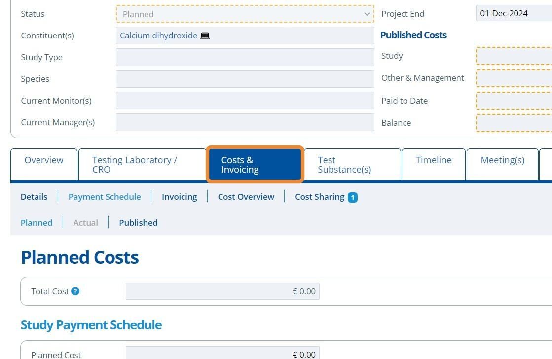 Payment Schedules keep track of expected invoice amounts and dates. They also define how the overall cost of a study is broken down. Costs are split into the following sections:
