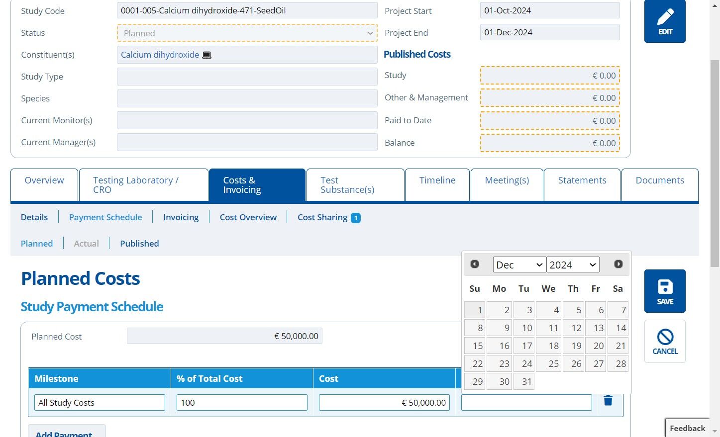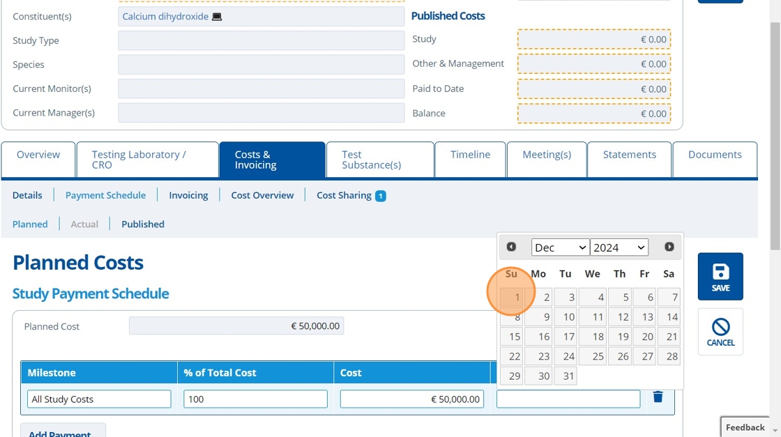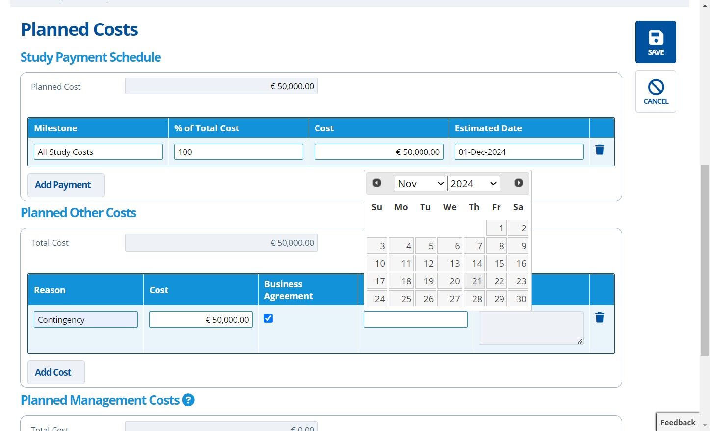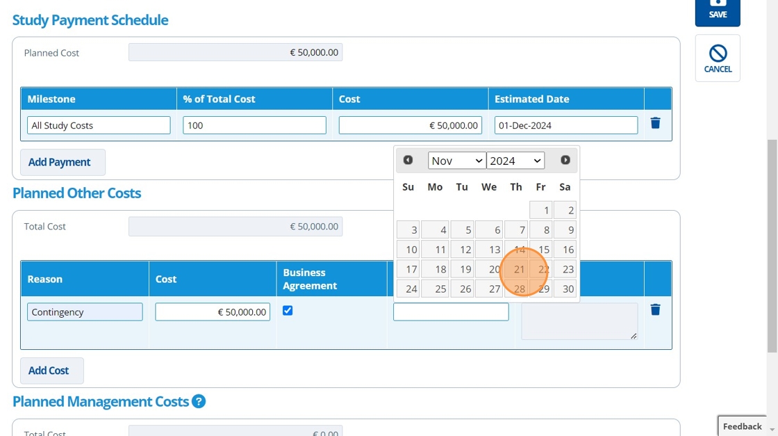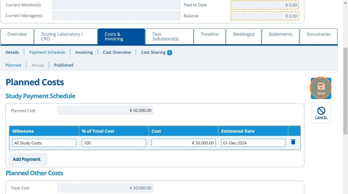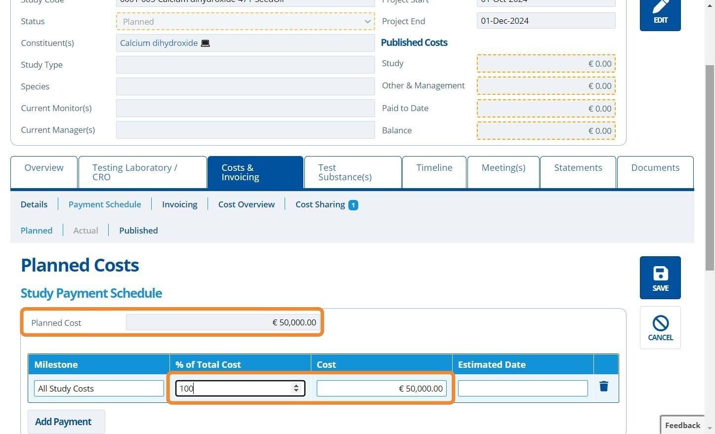 5. ✍️ Fill in the "Planned Cost" field. This field needs filling in first as it is used to calculate the payment milestones below it.¶