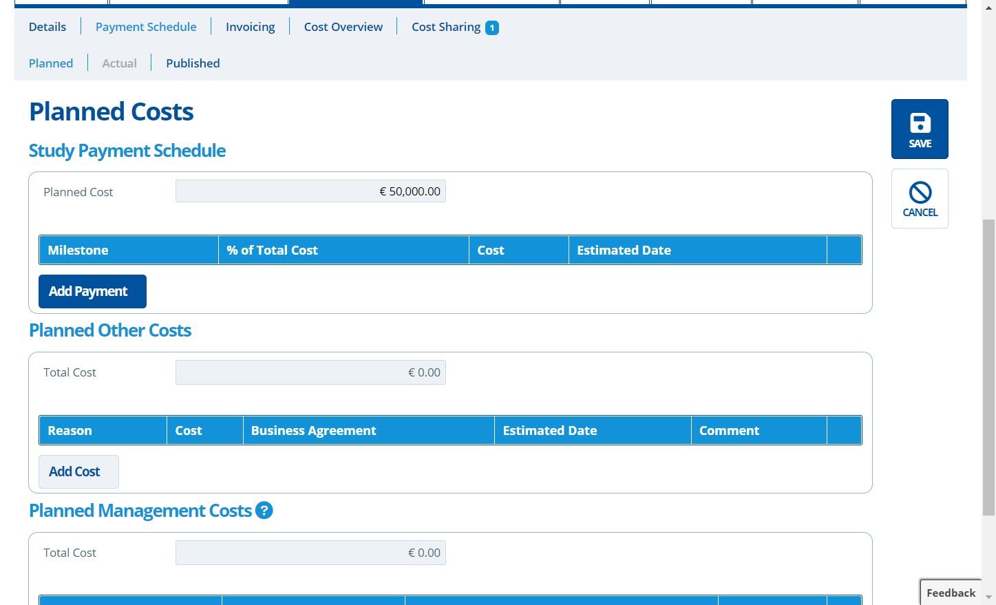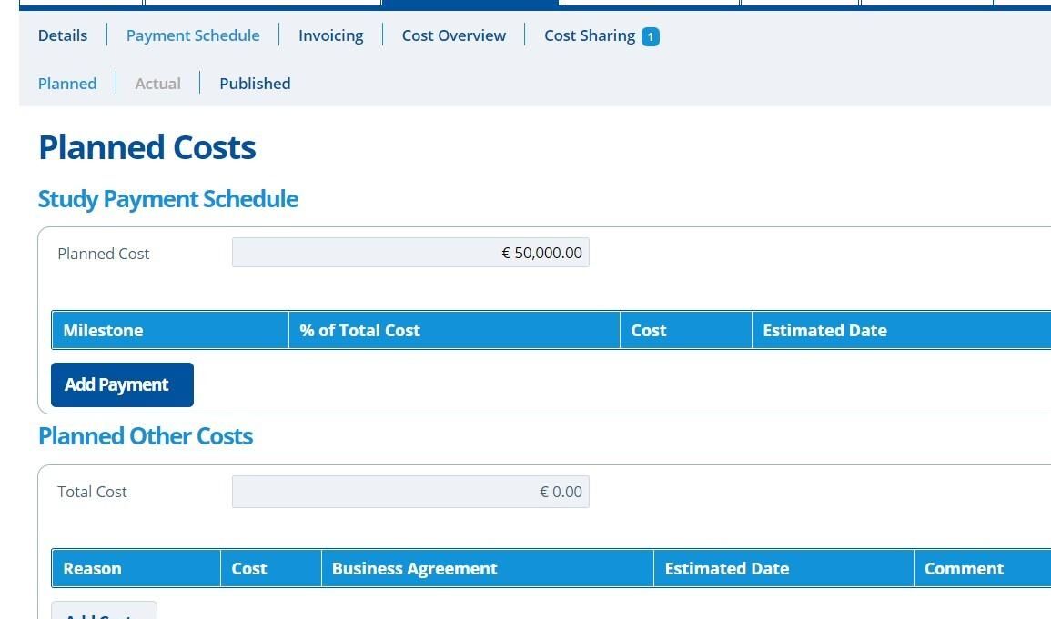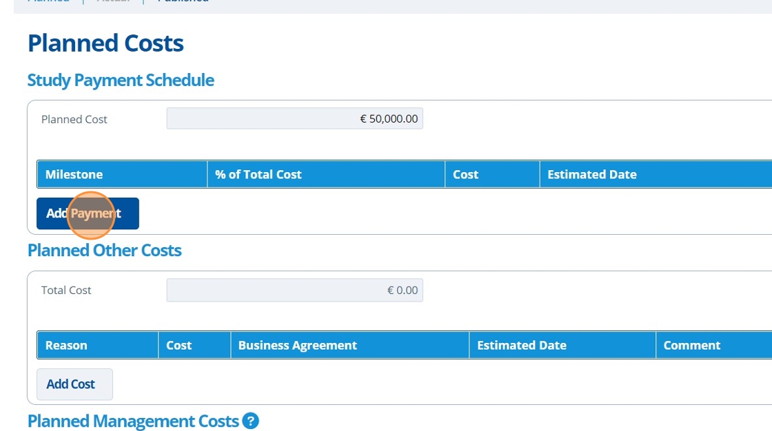 The Payment Schedule tab is split into 3 sections; for "Planned", "Actual" and "Published" costs. "Planned" costs are usually an estimate and are filled out before the study commences. "Actual" costs are completed in line with receipt of a signed contract. Both "Planned" and "Actual" costs can be "Published". "Published" costs cascade throughout the system, to be used in other areas of Active Steward, such as cost overviews and campaign pages.