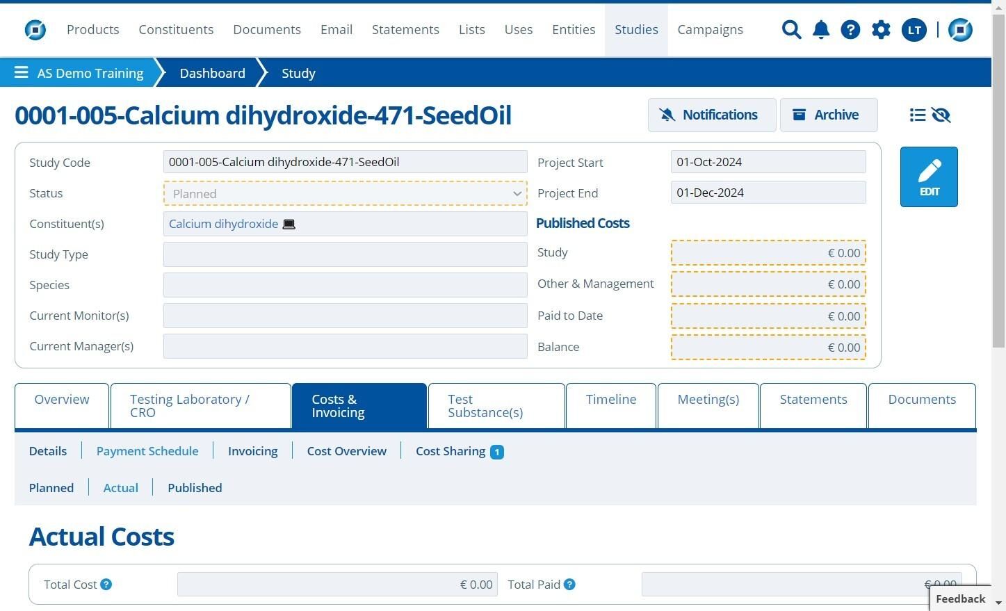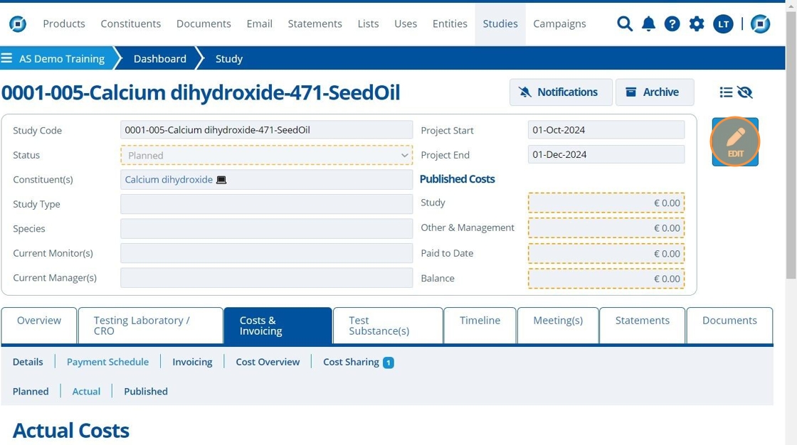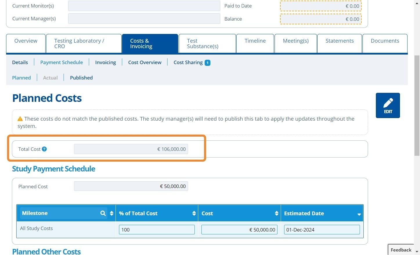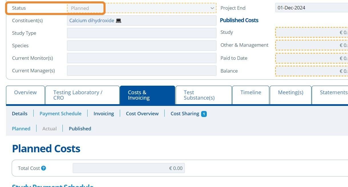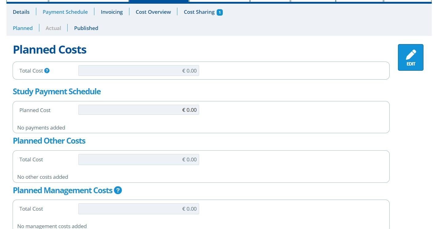 Planned Costs cannot be edited unless the study status is set as "Planned".